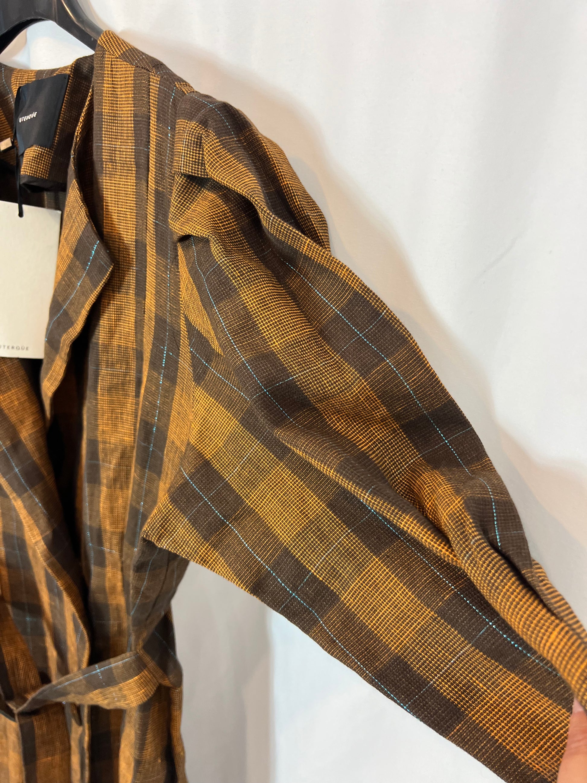 NUEVO CON ETIQUETA. Vestido midi marrones con detalle de hilos metálicos. Abotonado