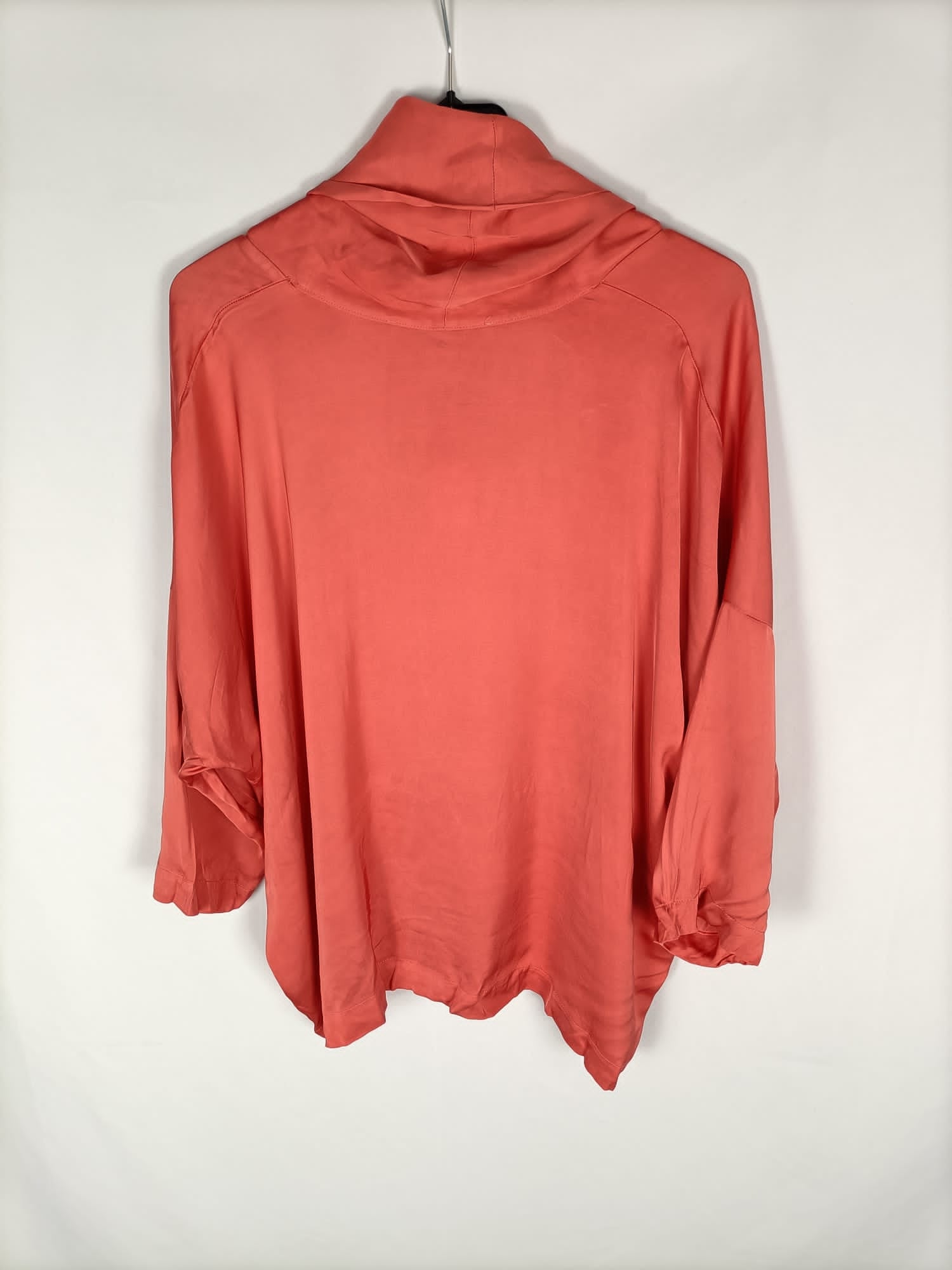Blusa fluida tono rosa oversized. Manga 3/4. Cuello vuelto amplio