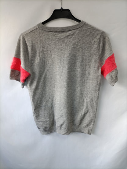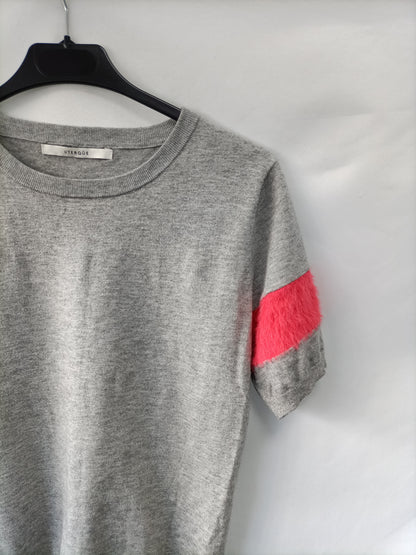 Jersey gris de punto de manga corta con las mangas con pelito rosa. De sisa a sisa 45, largo 45 cm