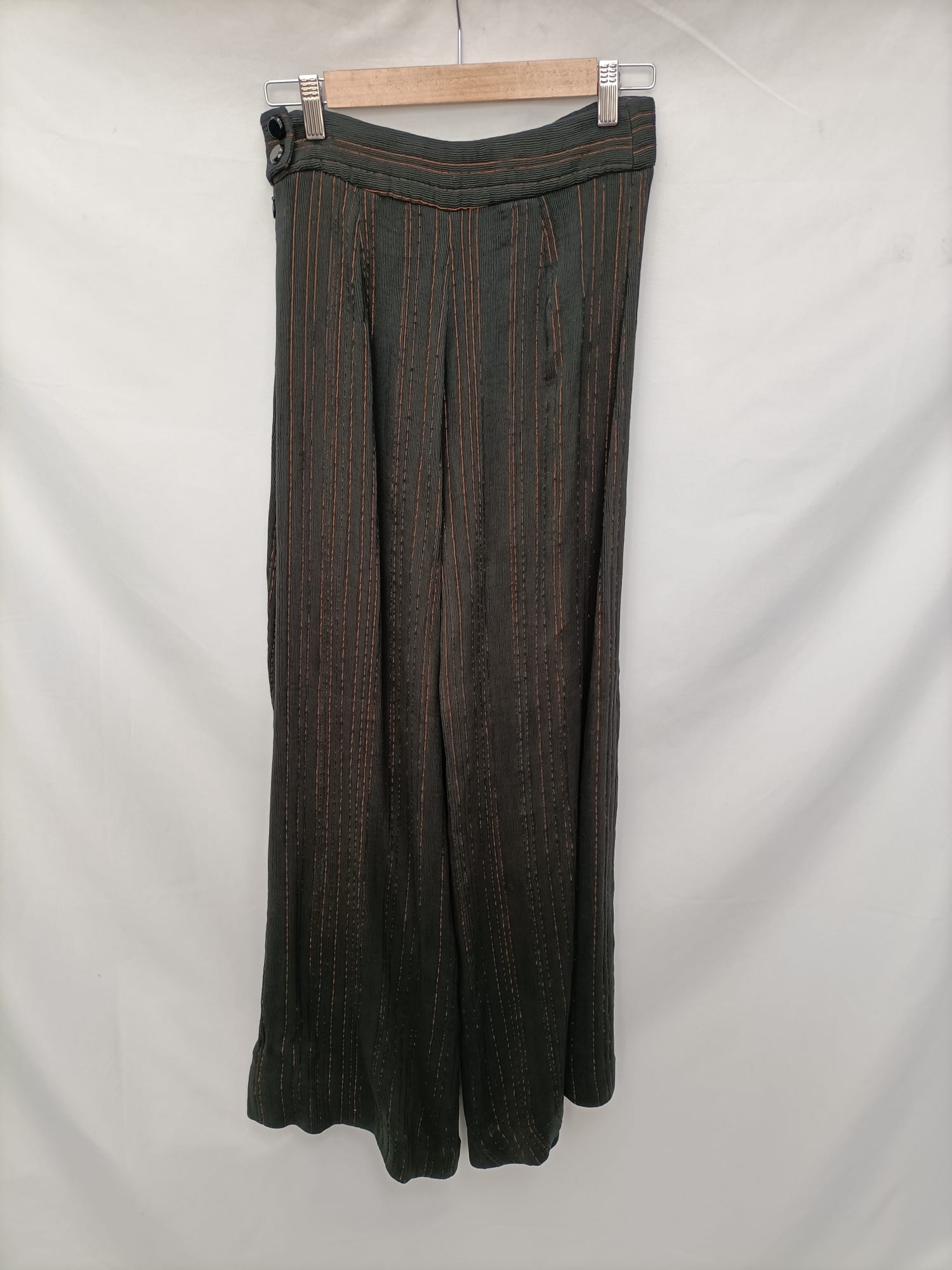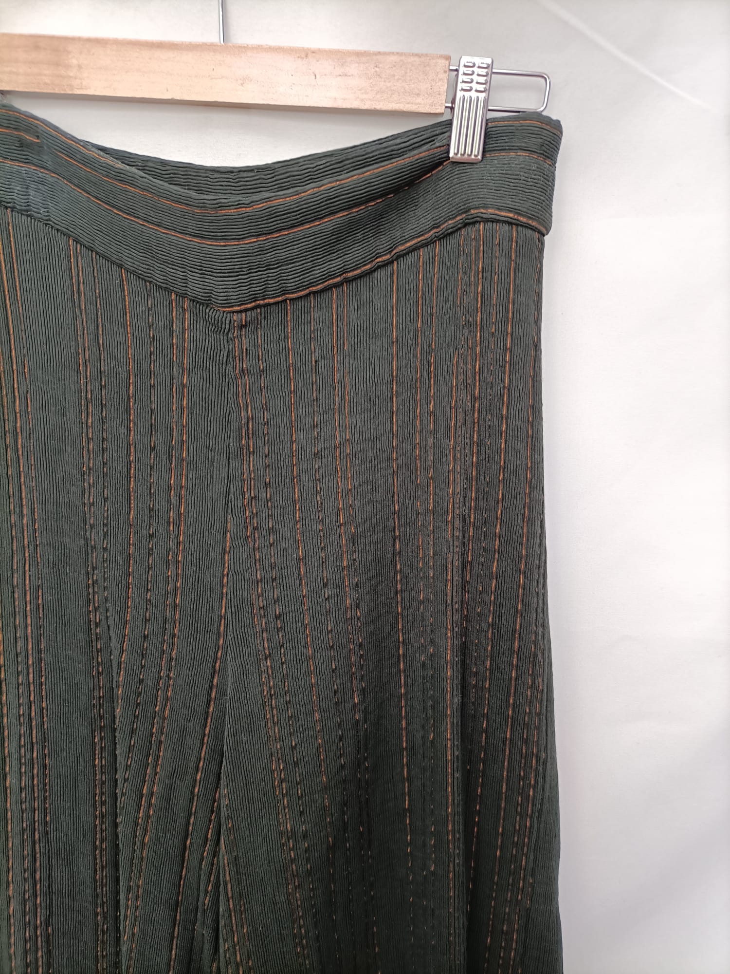 Pantalones verdes textura rayas ocre estilo culotte acampanados.No elásticos.cintura 36/38cm, largo 106cm