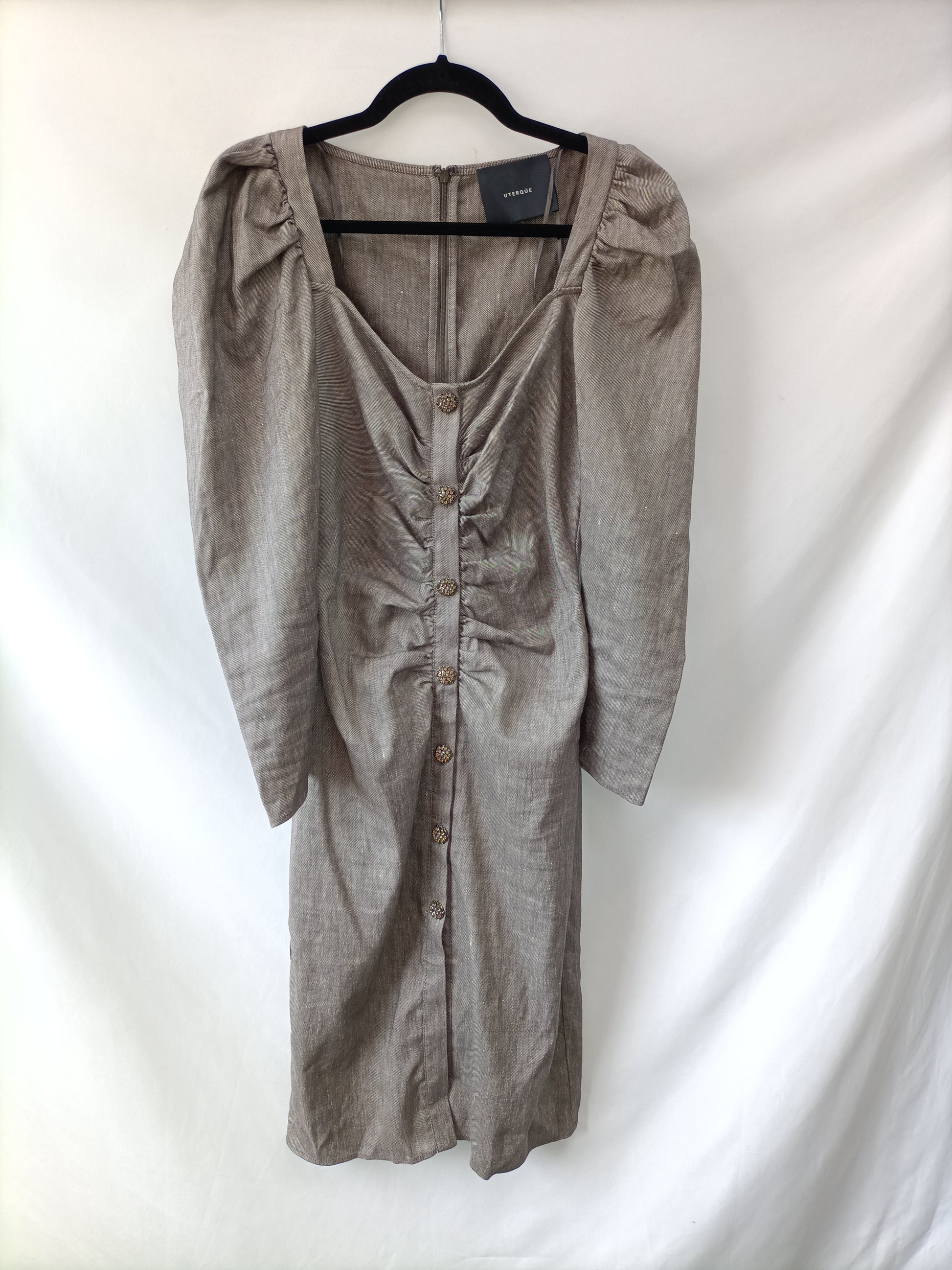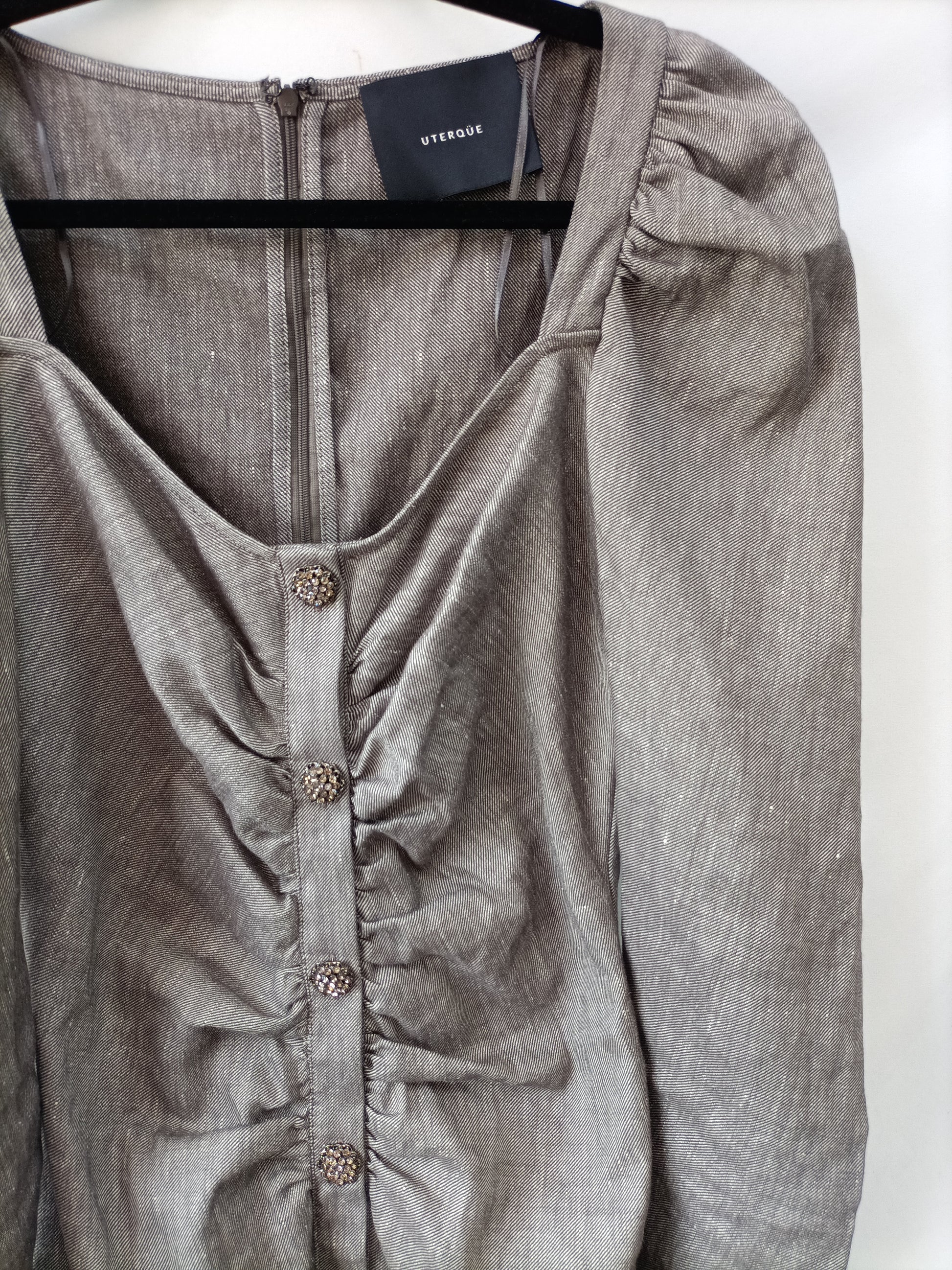 Uterque. Vestido midi gris fruncido por delante y con botones de pedrería. .angas abullonadas. No elástico. De sisa a sisa 39 cm largo 107 cm