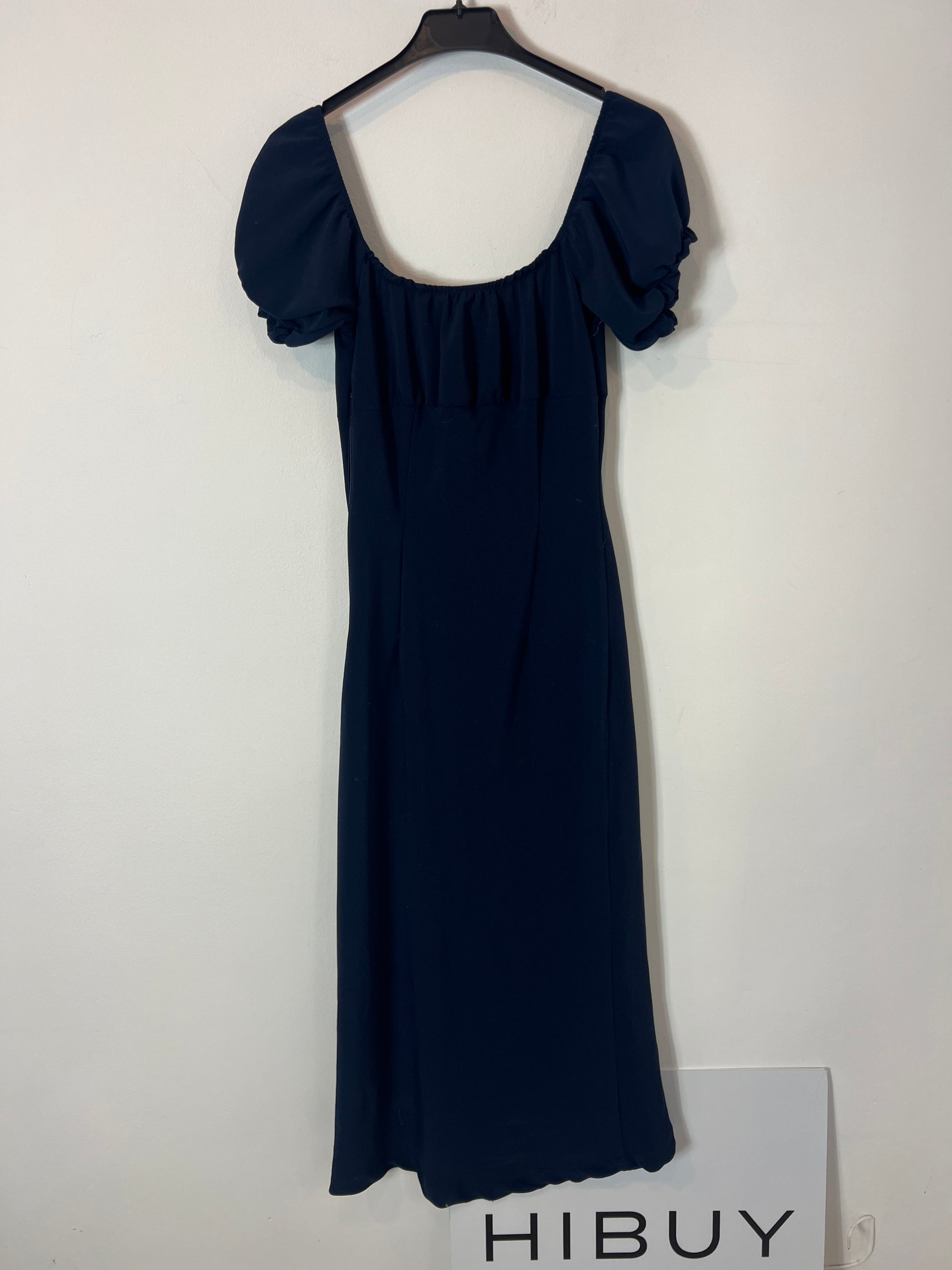 Vestido midi azul escote y mangas cortas ligeramente abullonadas.