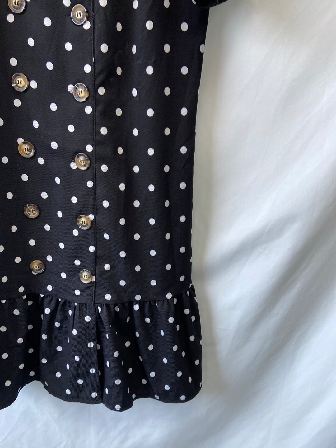 vestido corto negro lunares blancos tipo camisero con botones cruzados. Semielastico. Volante por debajo. Largo 90 cm .