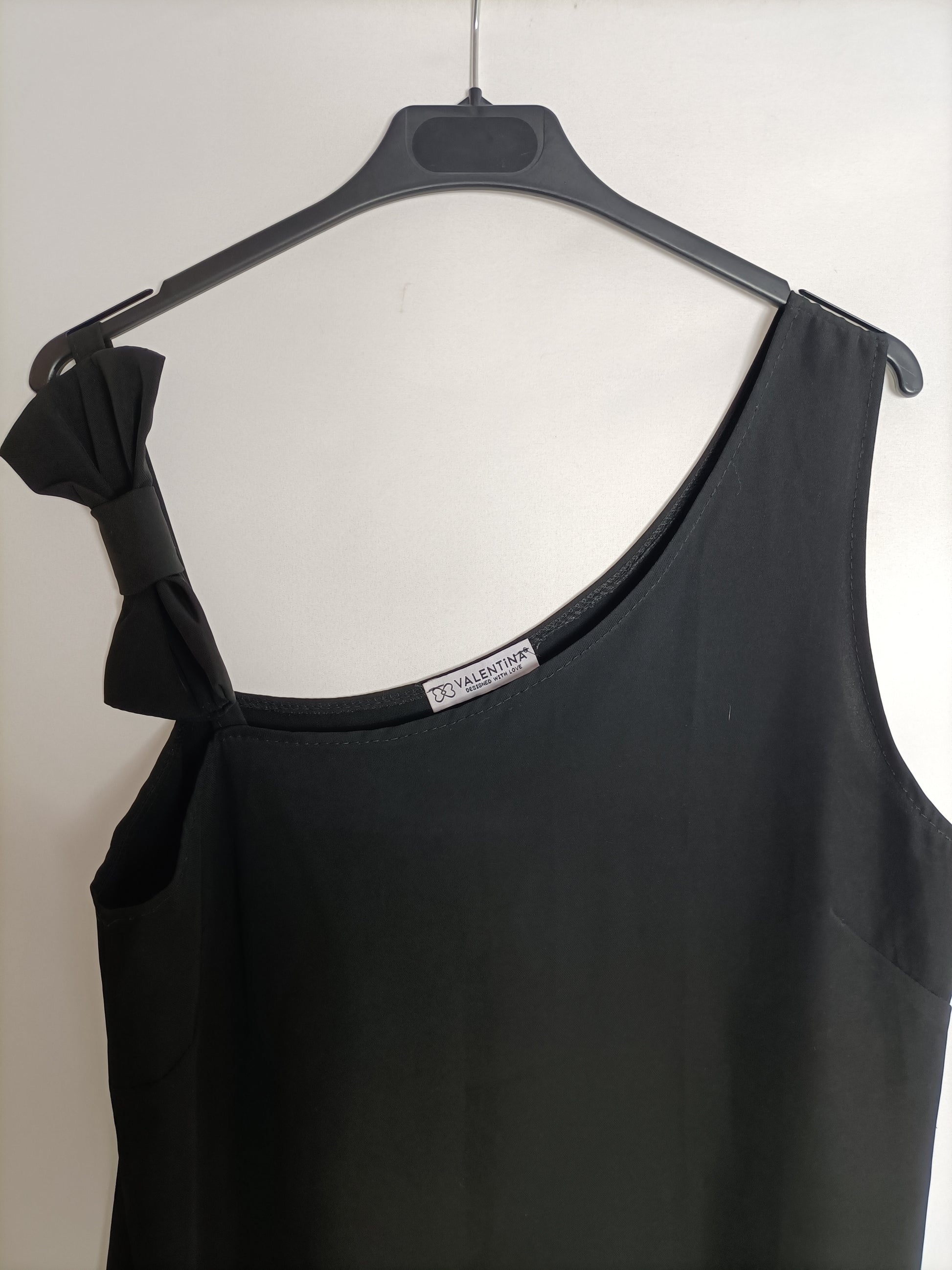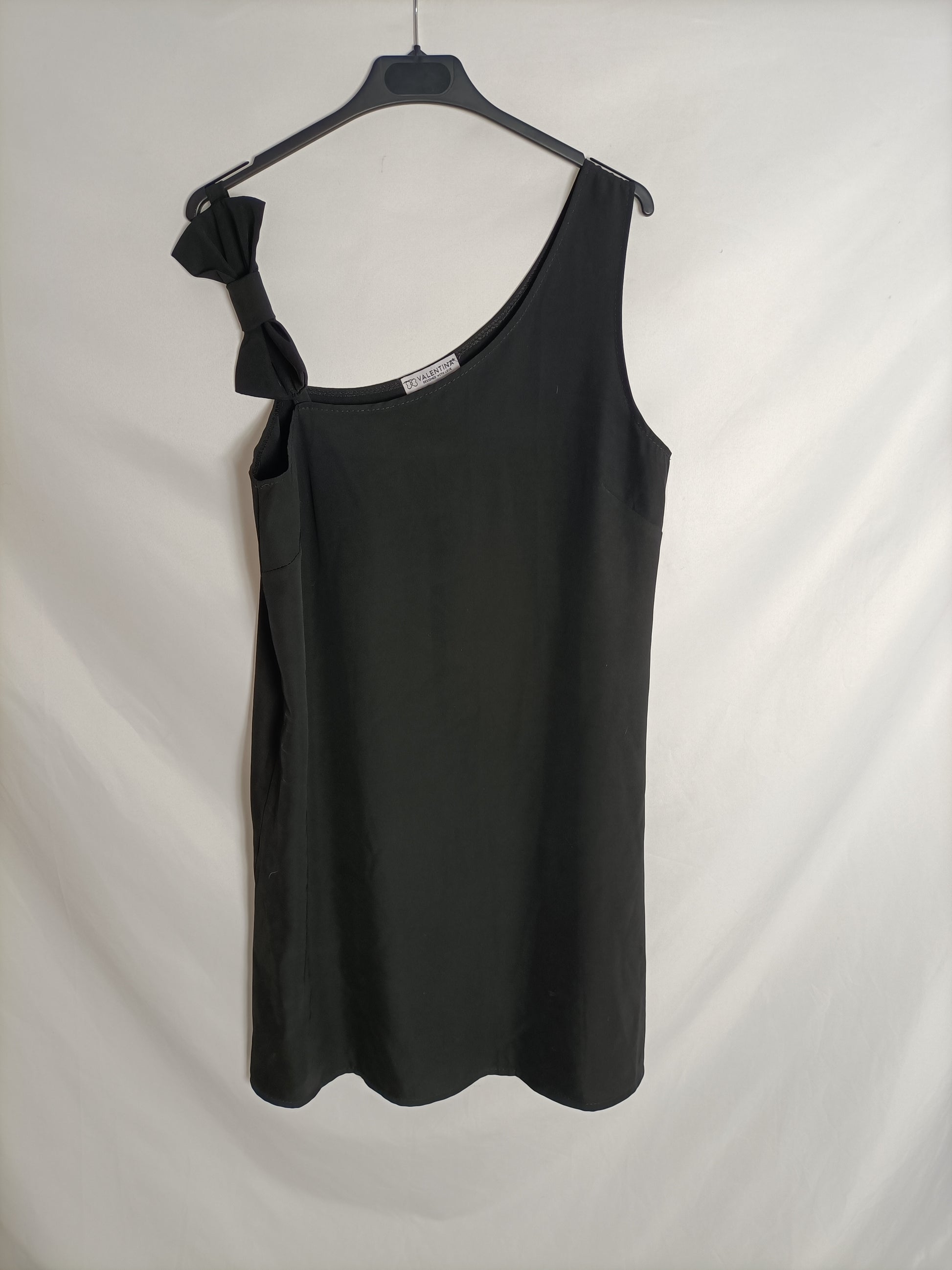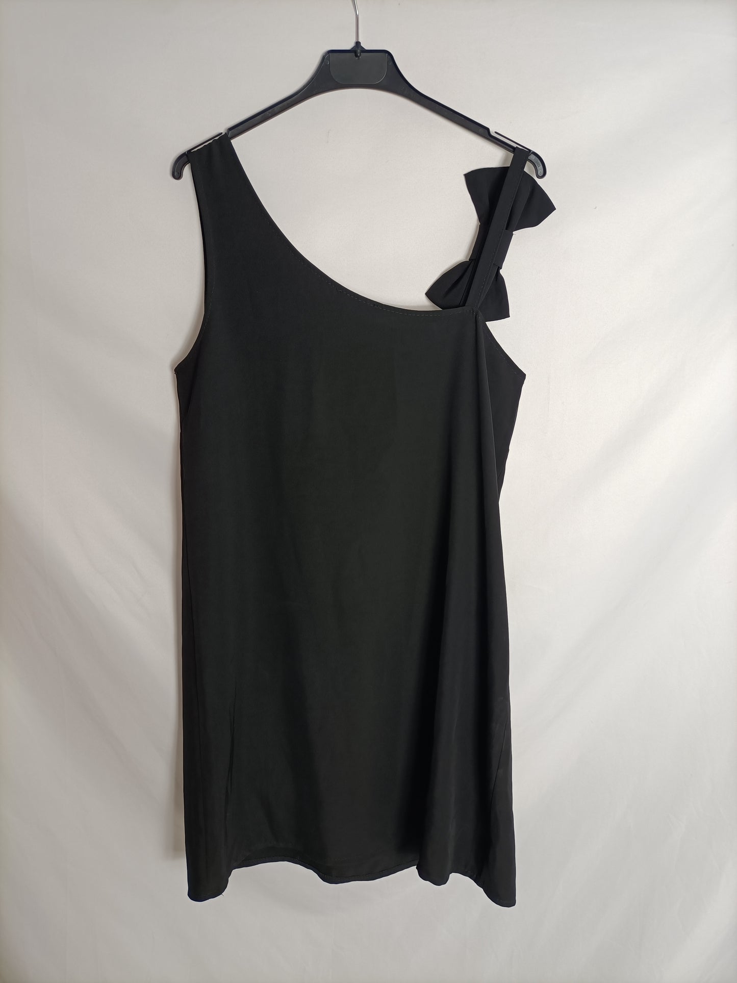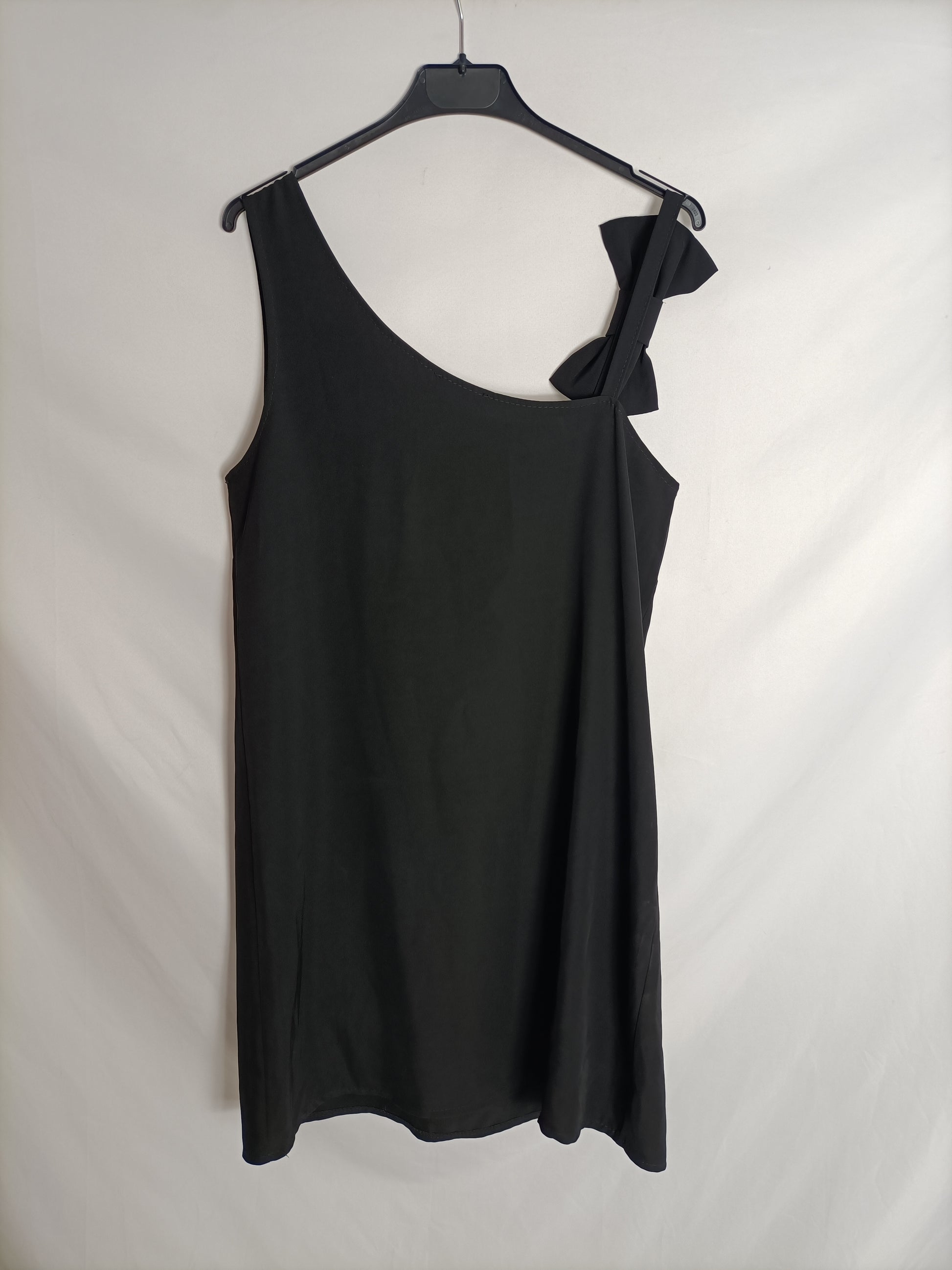 Vestido negro asimétrico con detalle de lazo. Semi elástico.