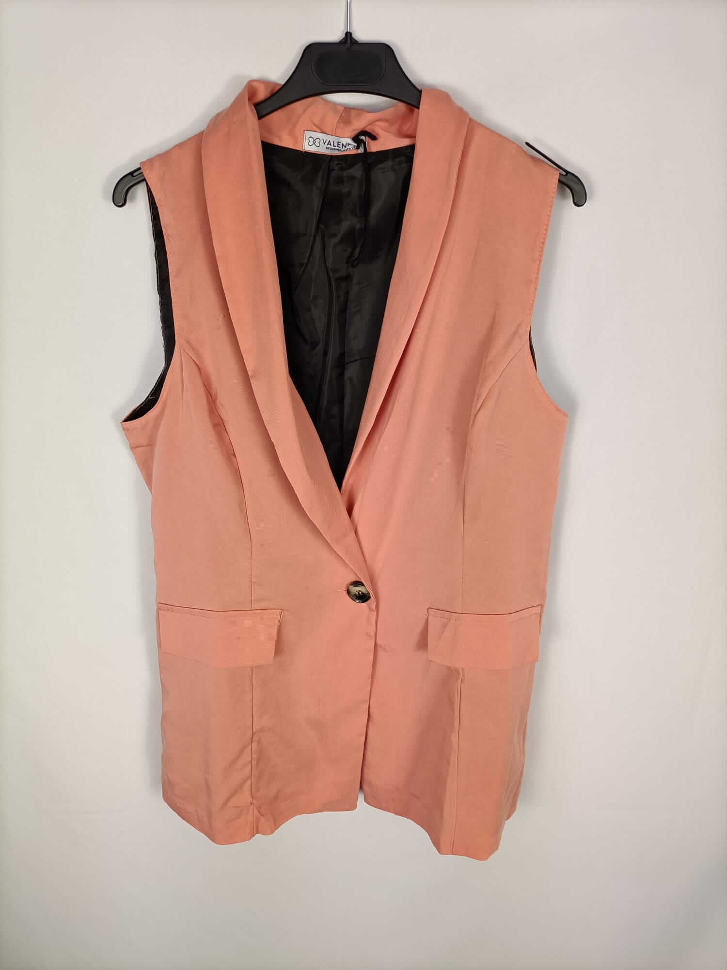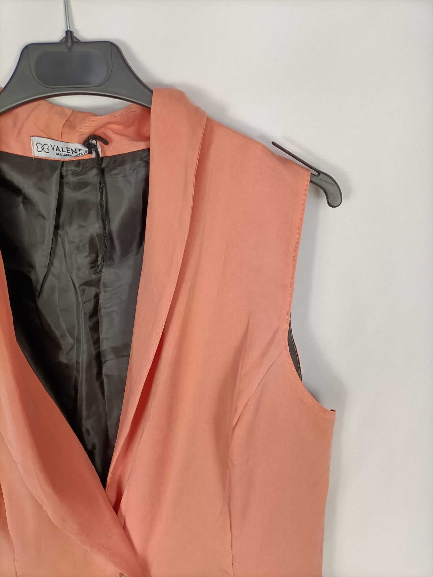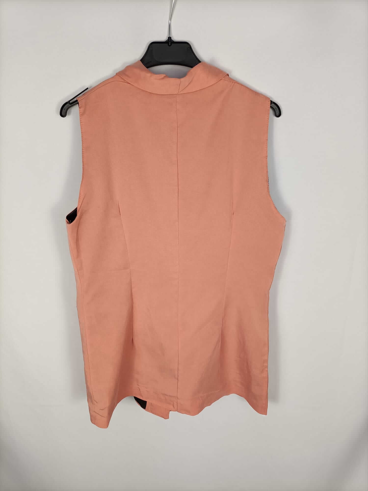 Valentina. L. Chaleco color salmón fluido y finito. Se abrocha con un botón. No elástico. De sisa a sisa 48 cm largo 81 cm