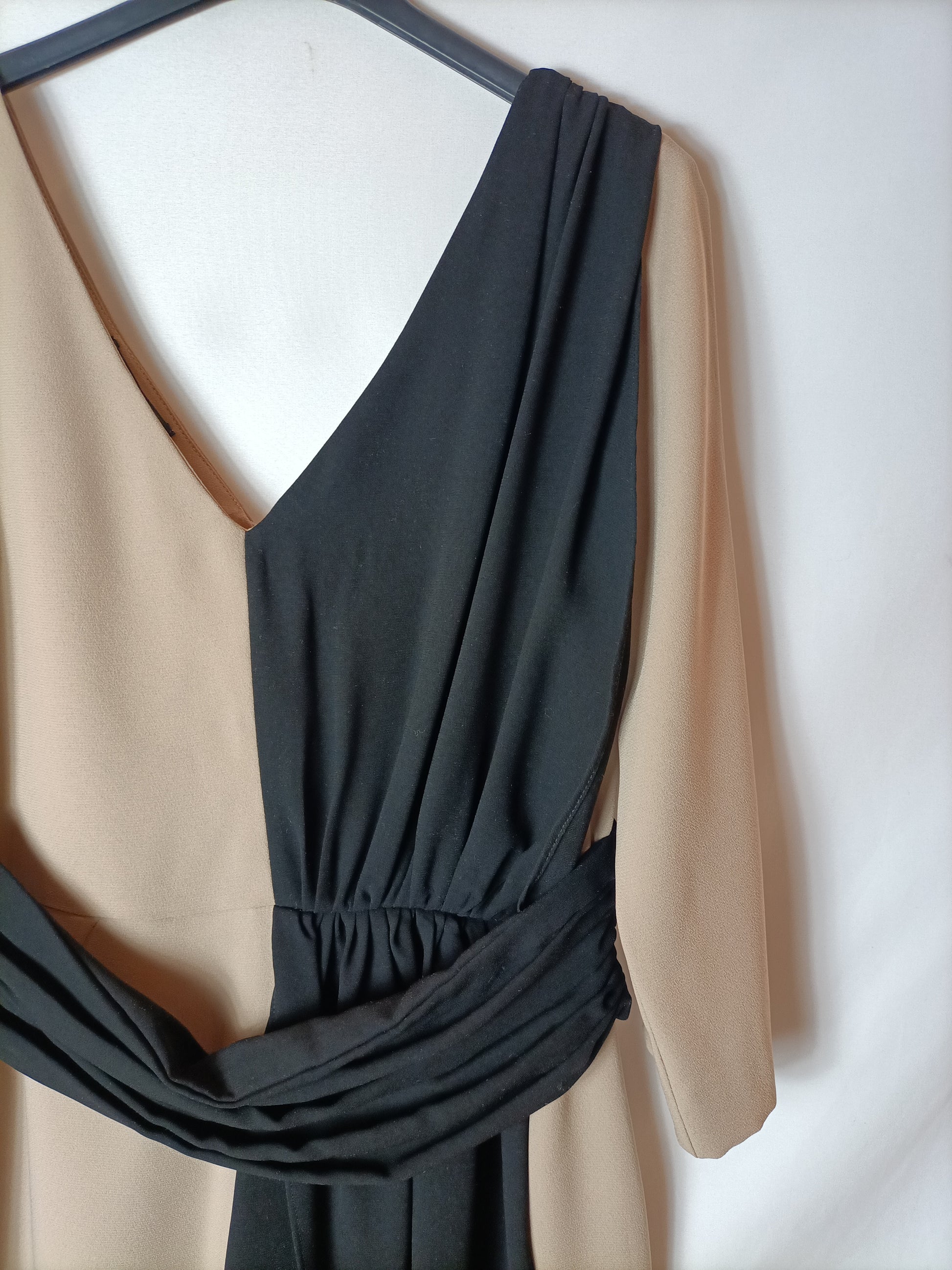 Vestido corto beige Camel y negro escote y espalda en pico. Largo por la rodilla. De sisa a sisa 42 cm