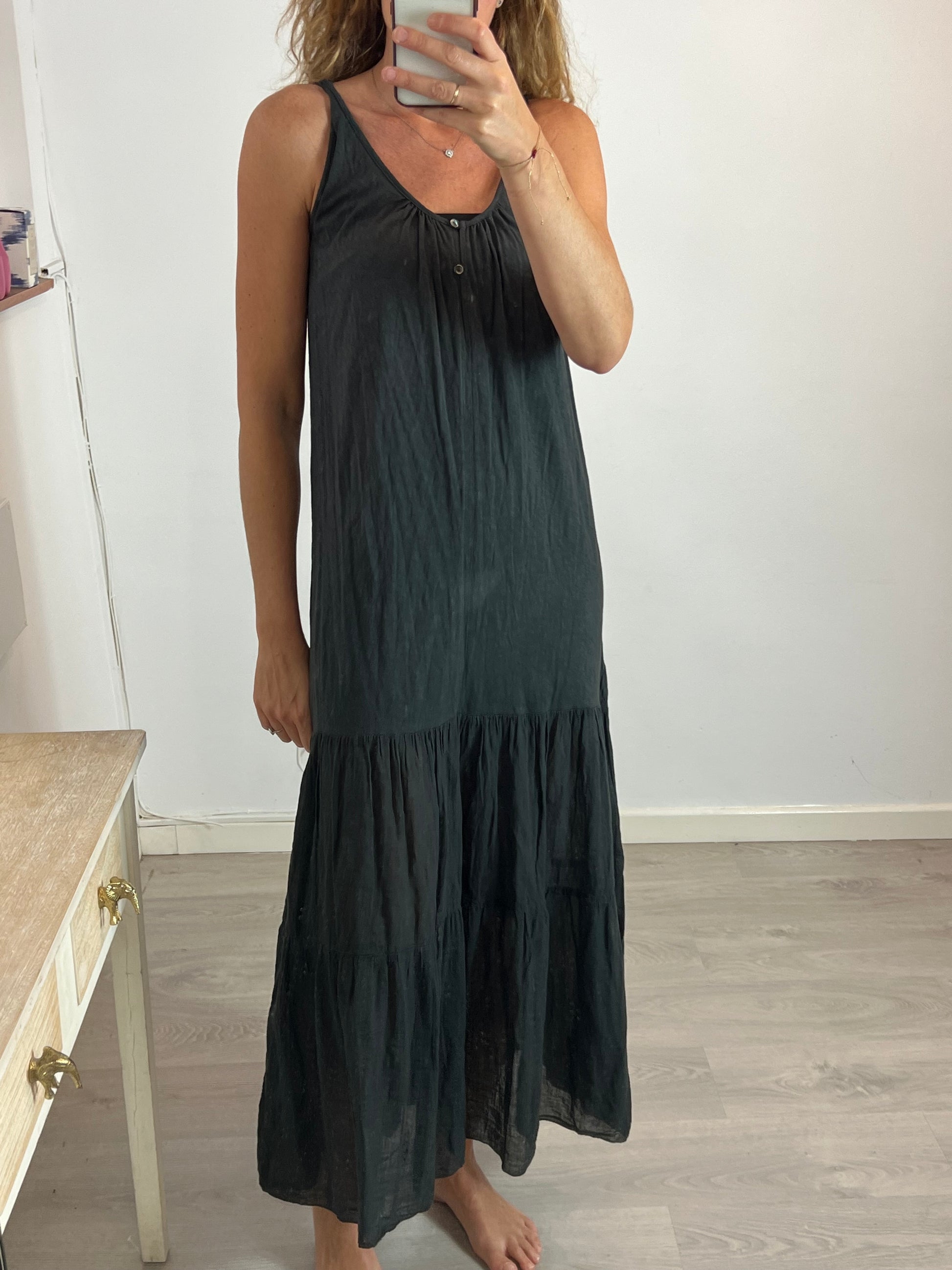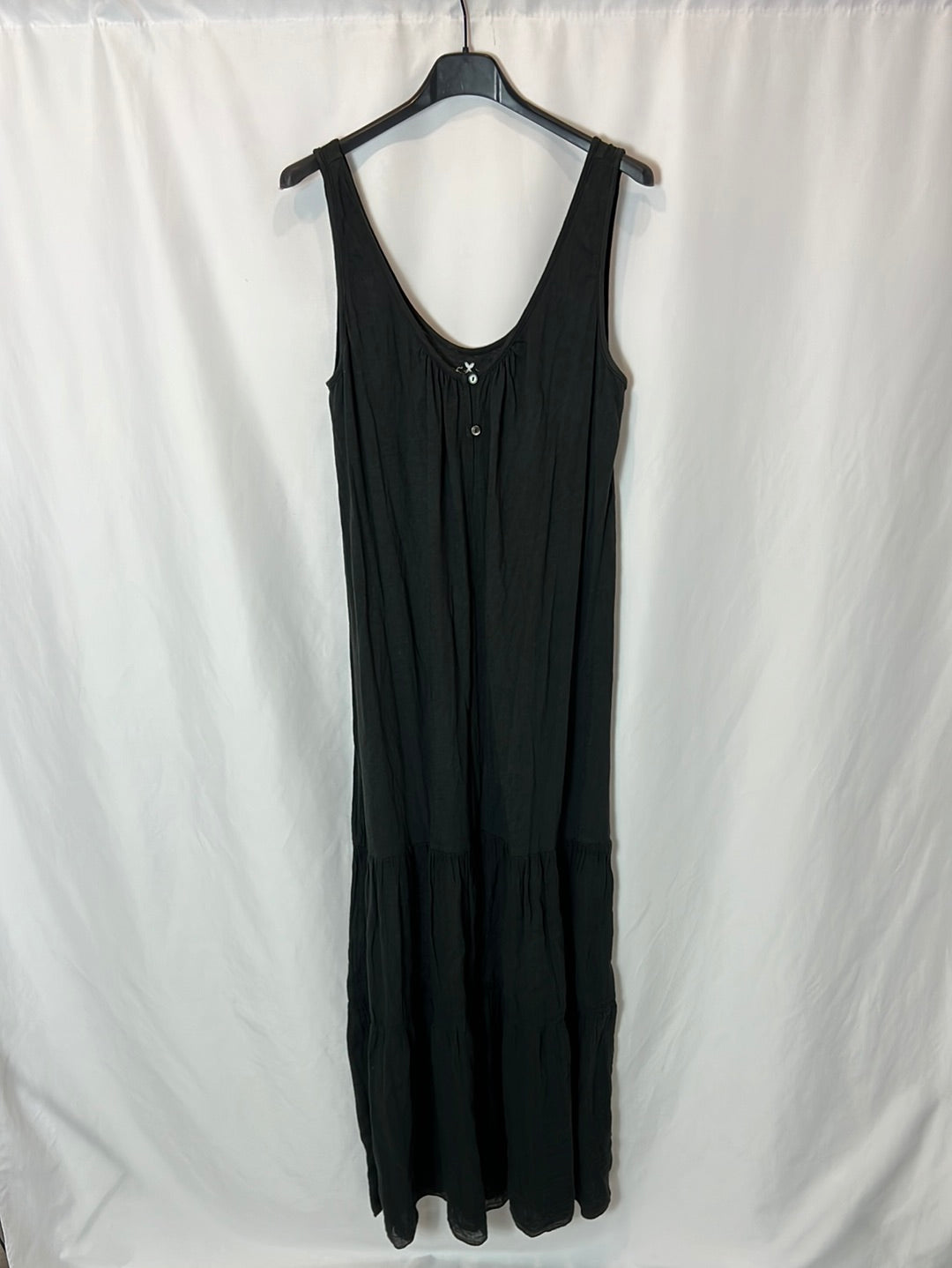 Vestido largo gris azulado. Talla única en etiqueta. Elástico. Espalda 44cm, largo 136cm
