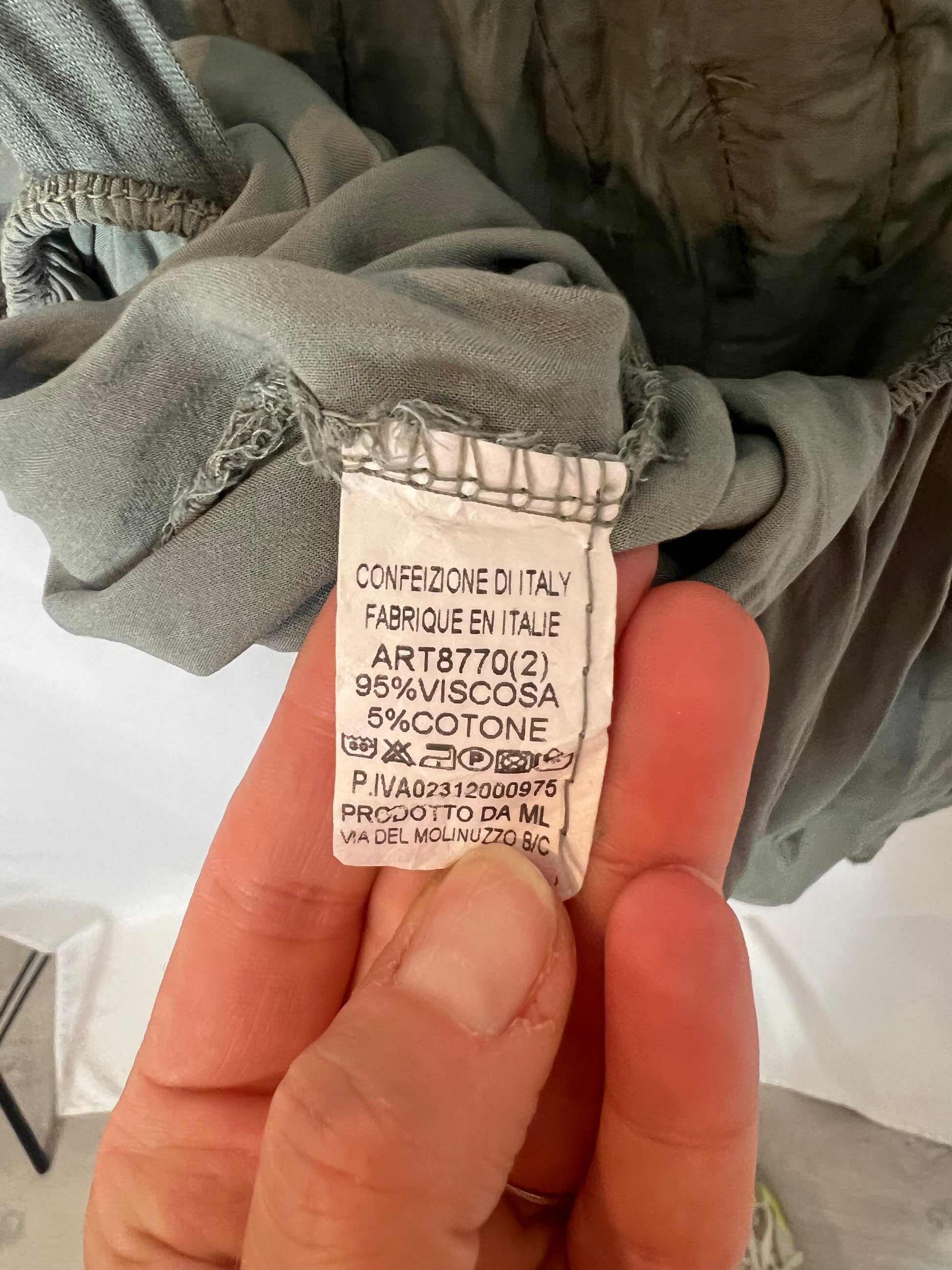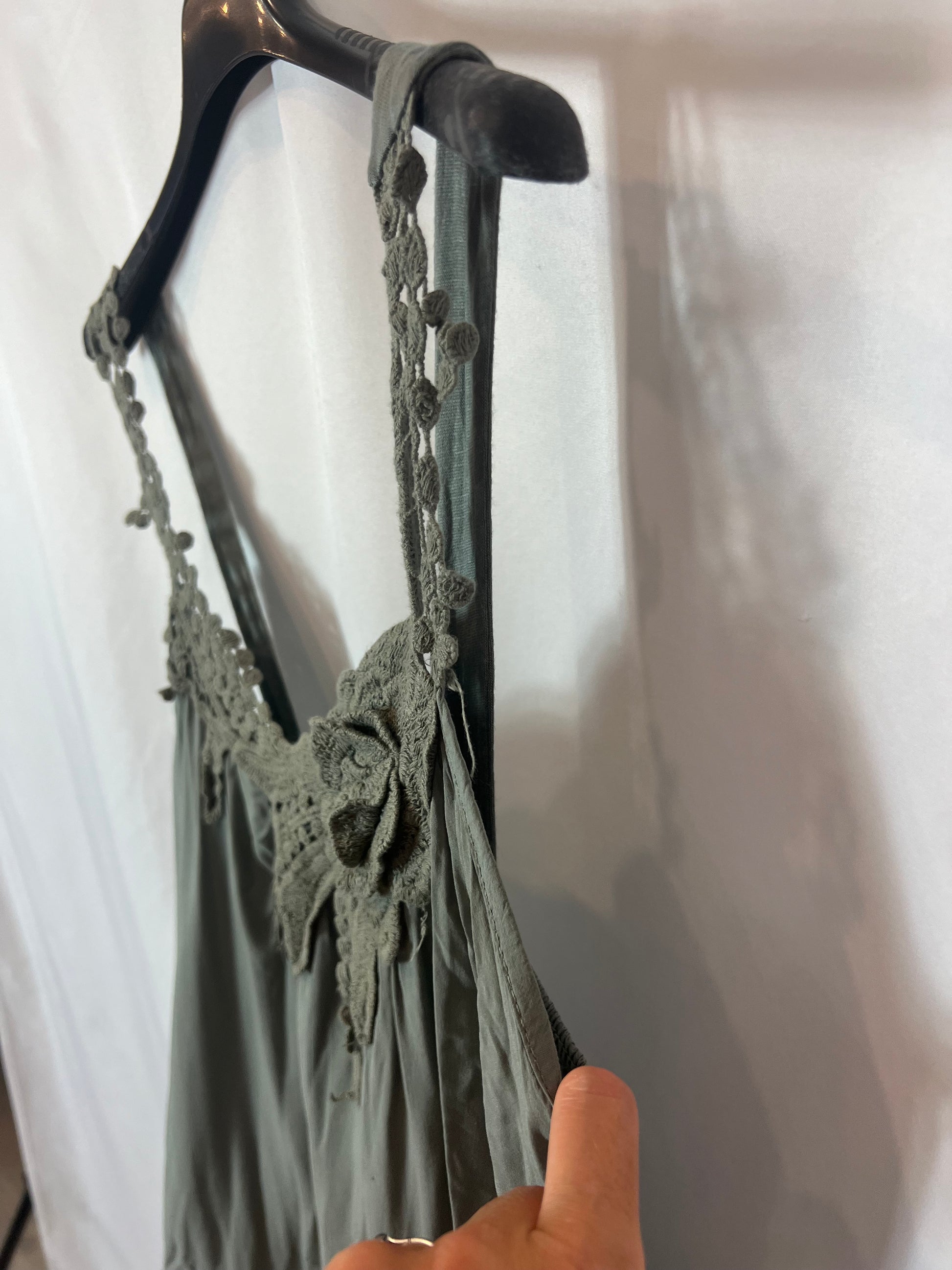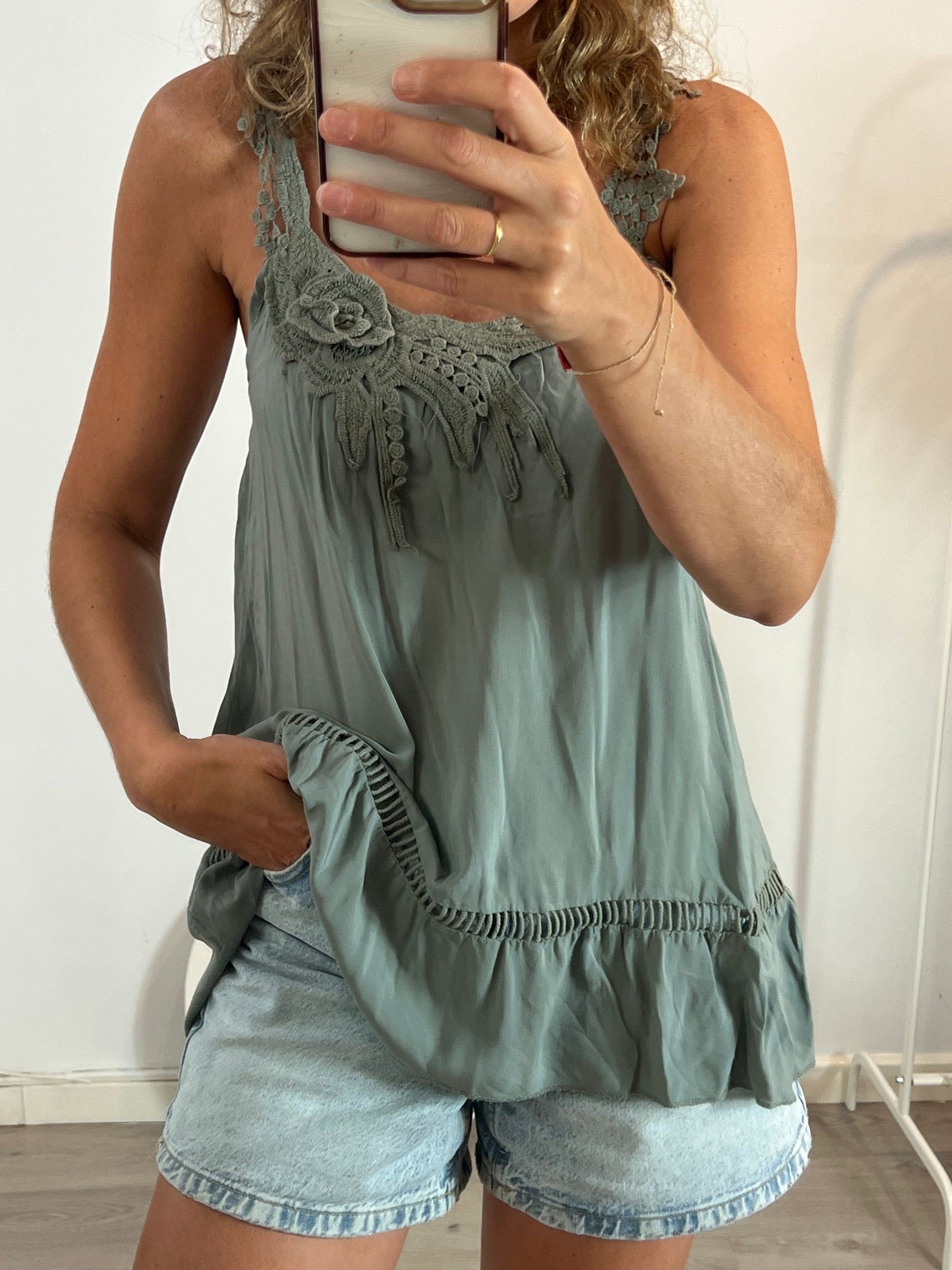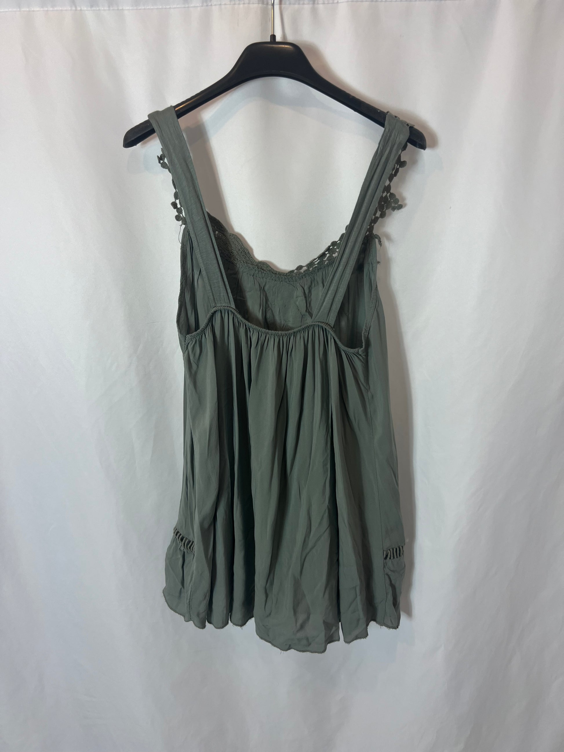 top verde fluido con detalle de croché en el escote. De sisa a sisa 42cm, largo 71cm