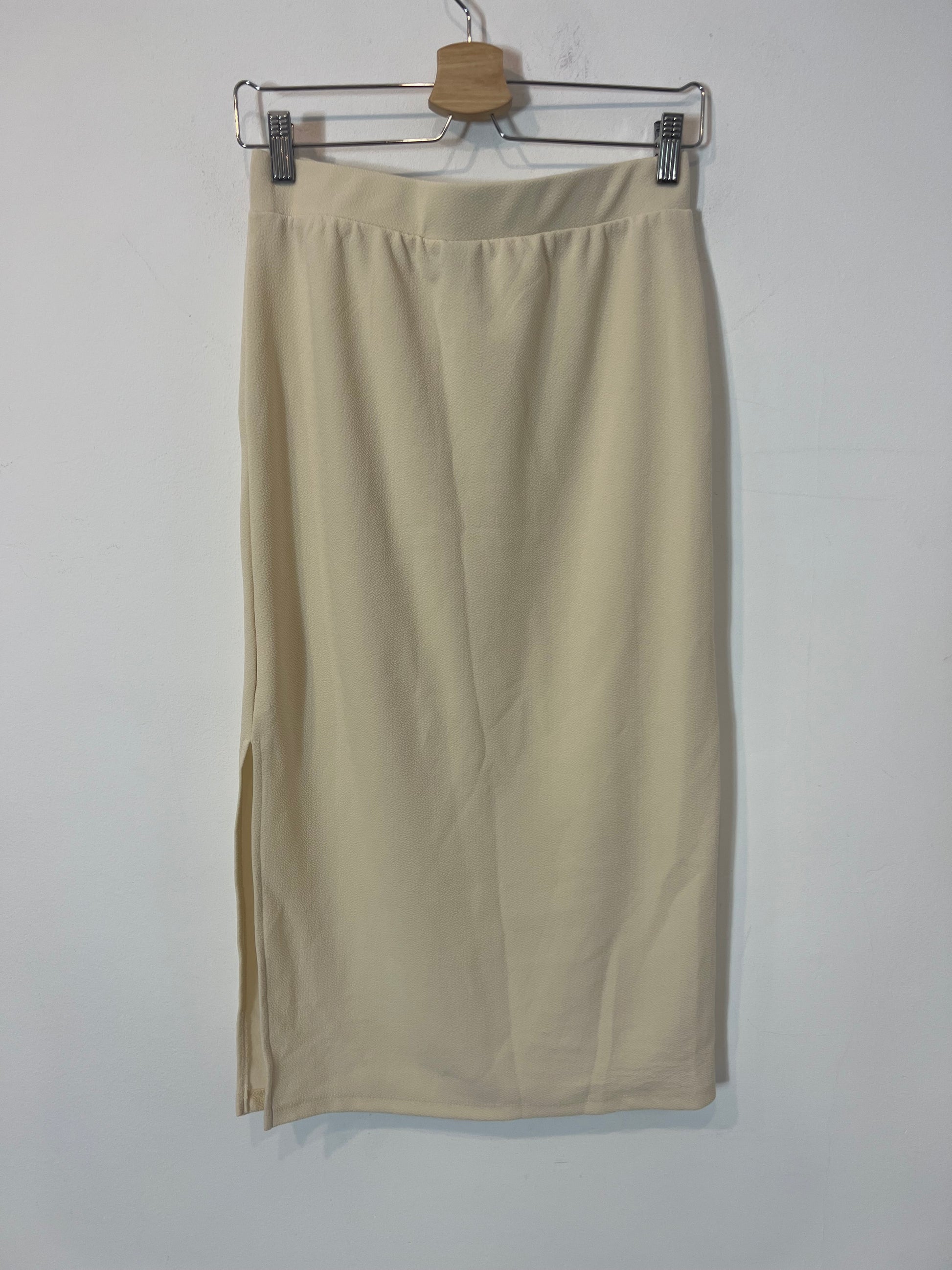 falda beige midi de tejido con textura. Elástica. largo 88 cm. cintura 36cm