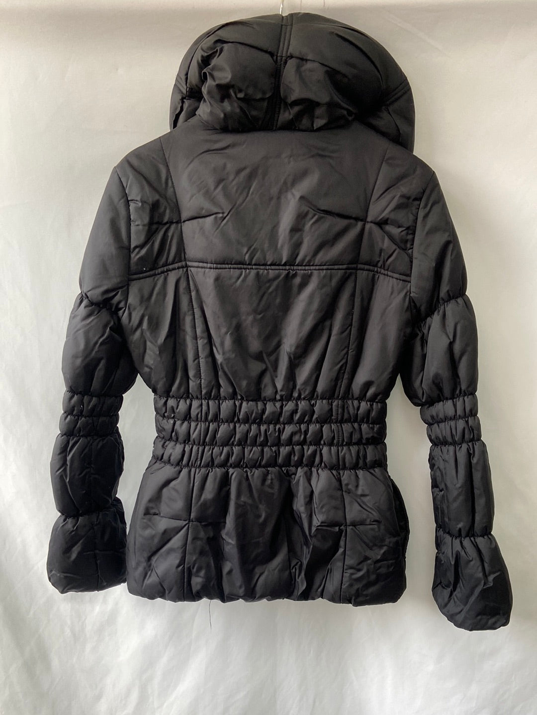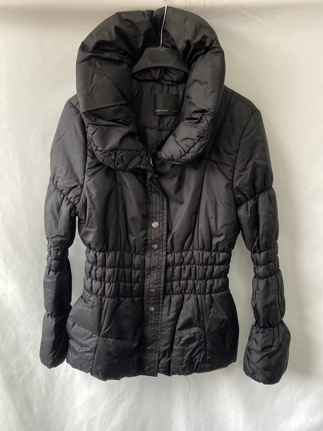 Abrigo plumas gordito negro entallado elástico. Largo 67 cm