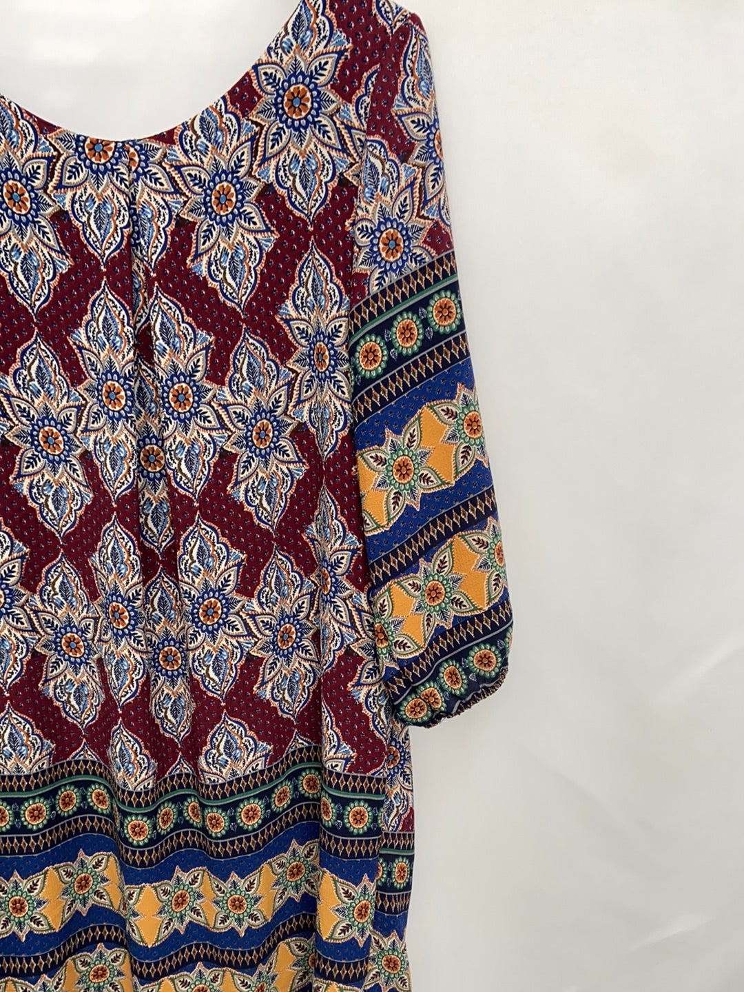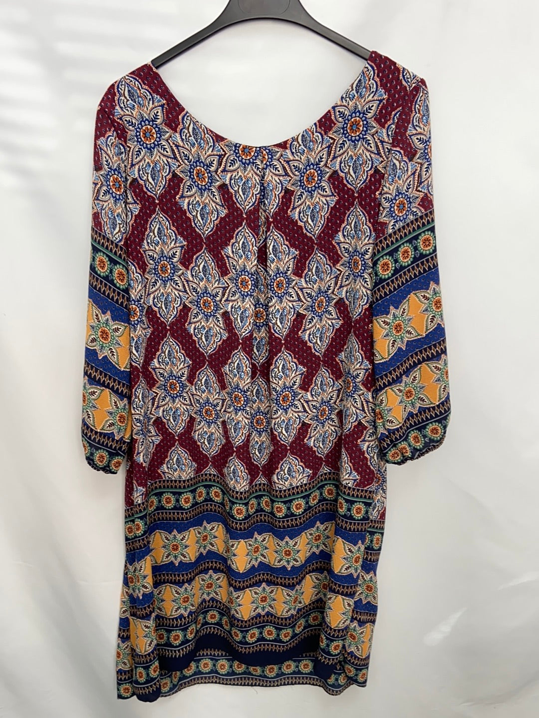 Vestido con fondo burdeos y estampado en tonos azules y amarillos. Escote cerrado. Botón detrás con pequeña apertura. Manga 3/4. forro interior. Semielástico
