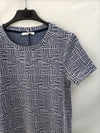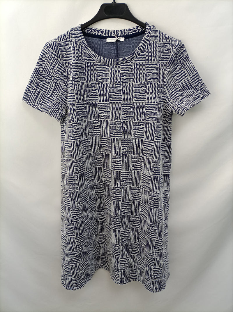 Vestido con textura. Formas geométricas en blancos y azules. Elástico