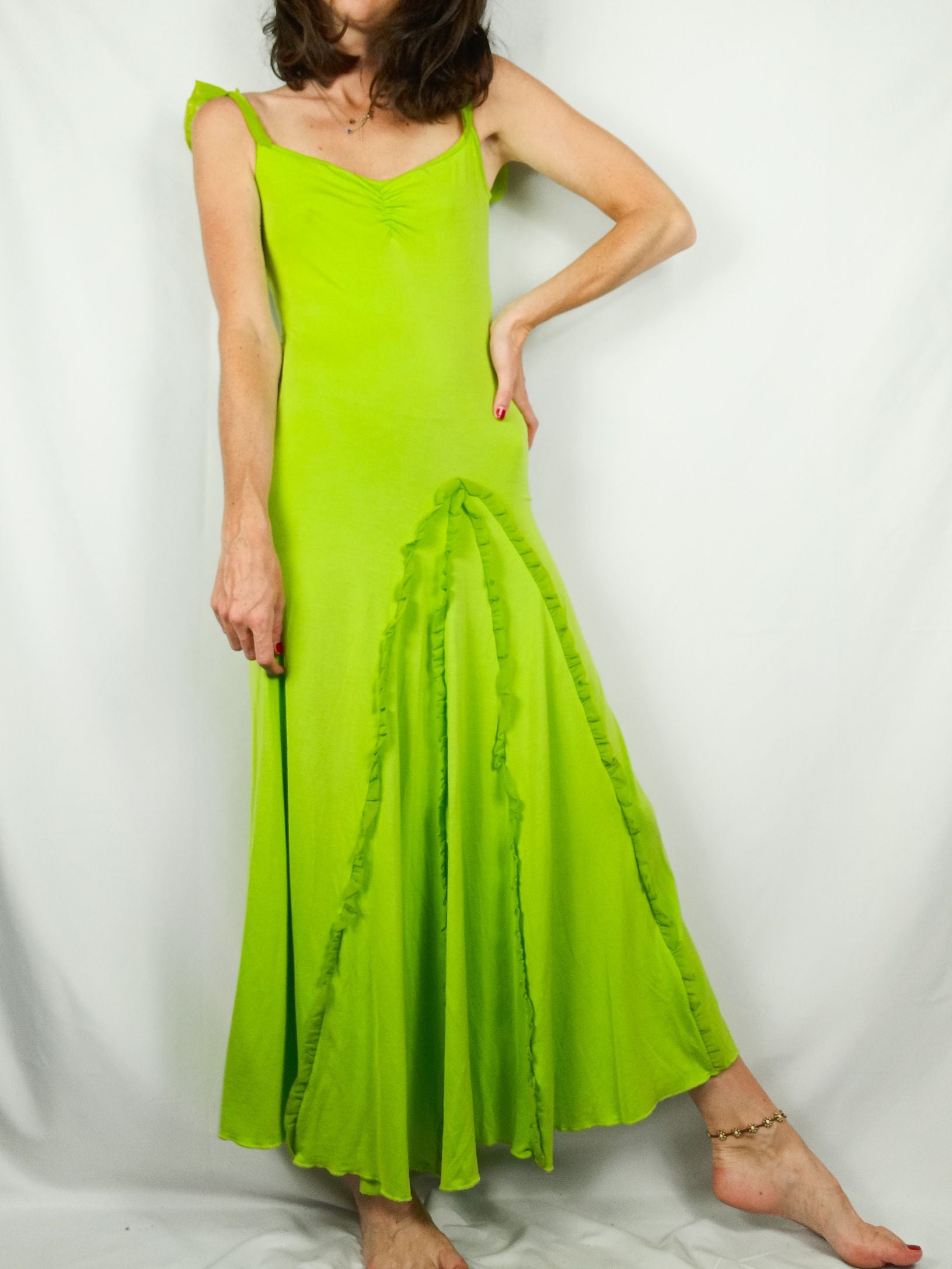 Vitorio y lucchino. Vestido largo verde elástico con volantes. Fluido. Largo134 cm