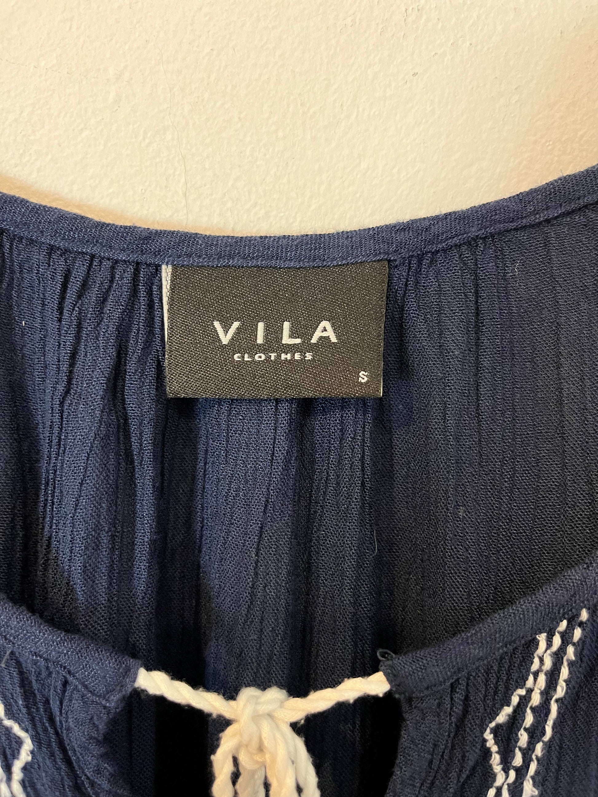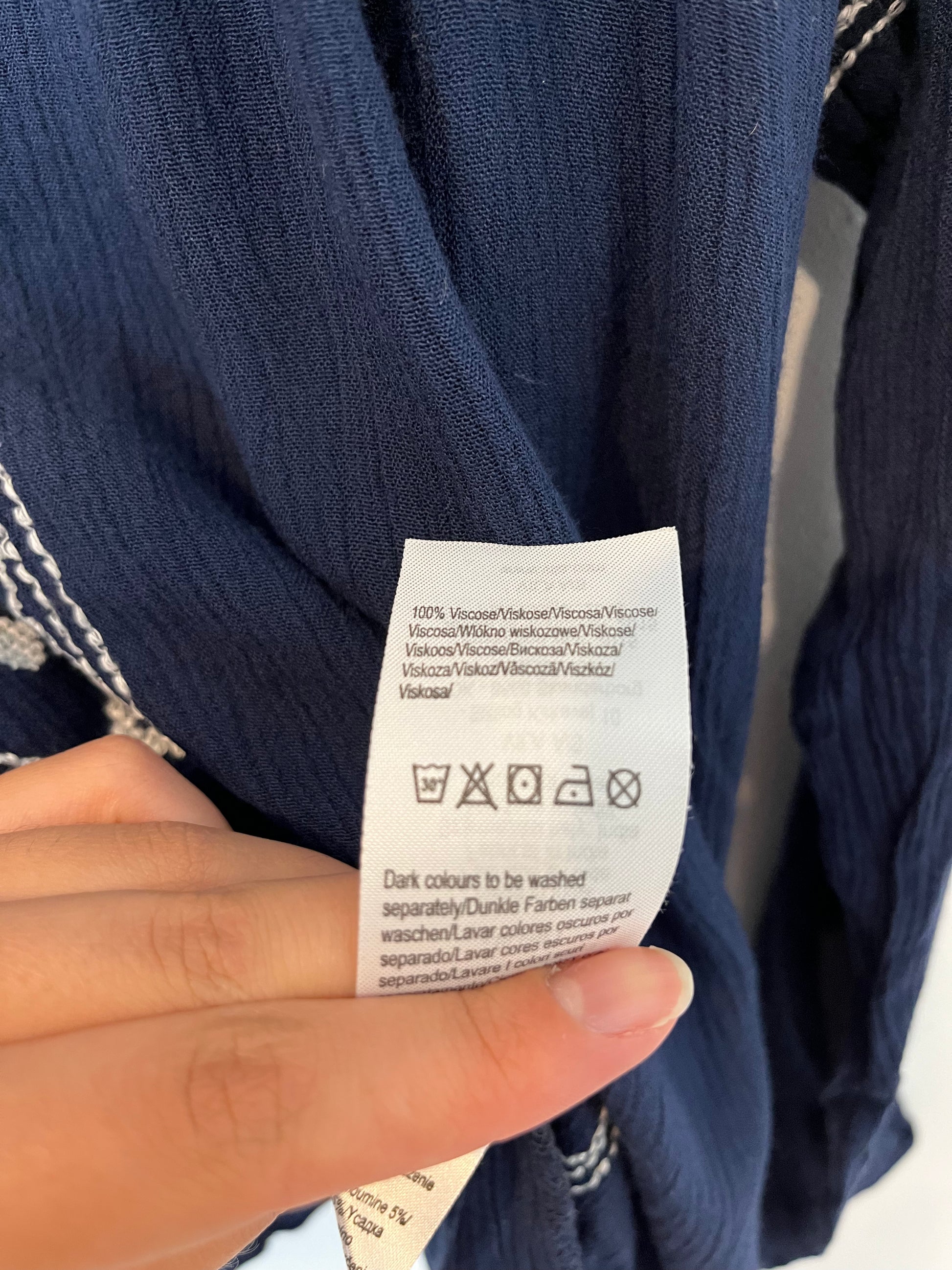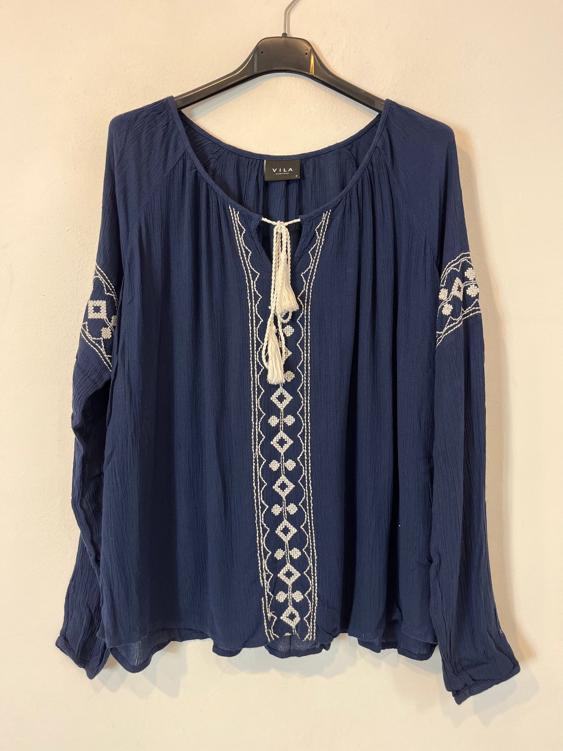 blusa azul fluida bordada. de sisa a sisa 52 cm largo 66 cm