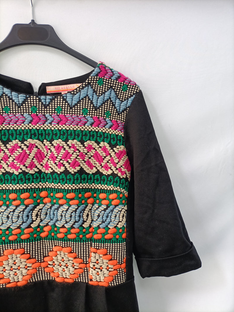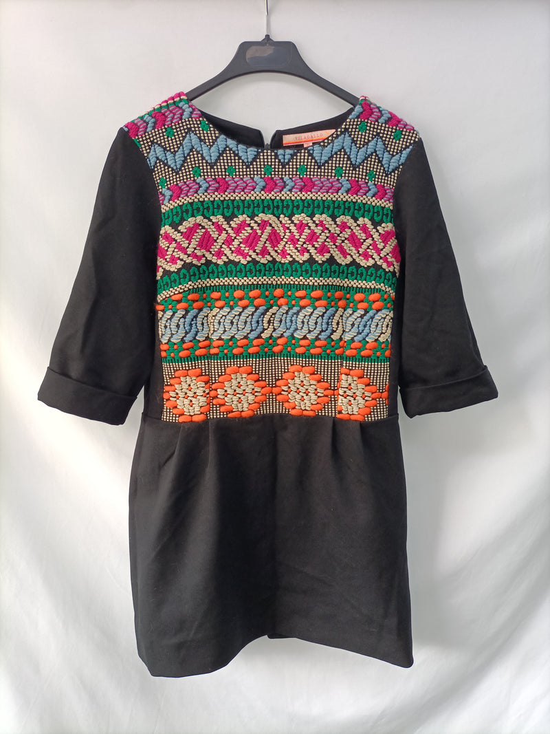NUEVO CON ETIQUETA. Vestido negro elástico bordado. Cremallera trasera. De sisa a sisa 42 cm y largo 82 cm.