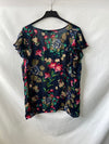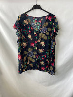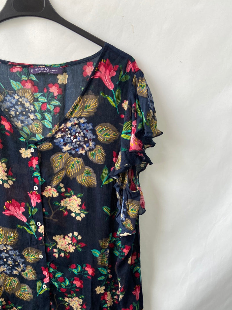 Blusa azul de flores con tejido tipo lino, detalles de lentejuelas y abalorios en algunas zonas y volantes en las mangas. Semitransparente. Largo 69 cm