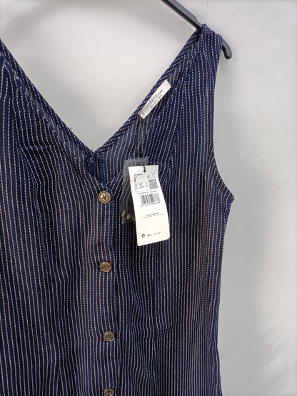 NUEVO CON ETIQUETA. Vestido azul corto abotonado con rayas bordadas. De sisa a sisa 49 cm Largo 90 cm