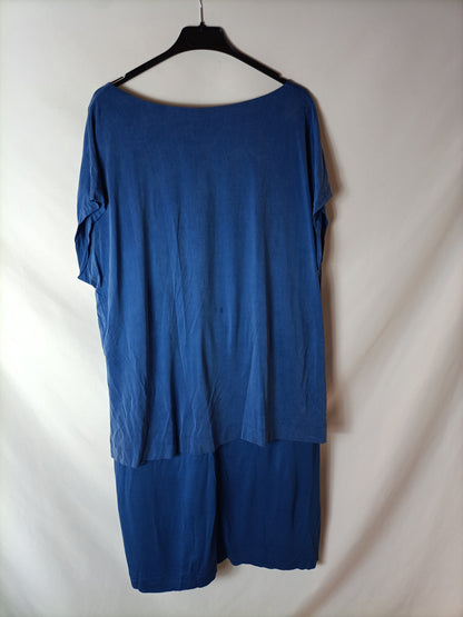 NUEVO CON ETIQUETA. Vestido azul largo por la rodilla con doble textura y parte de arriba efecto capa. Elastico