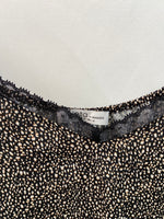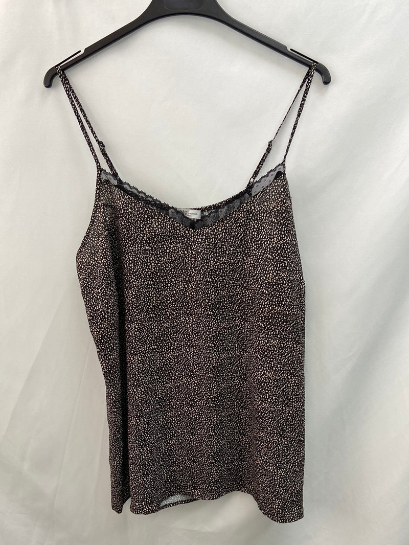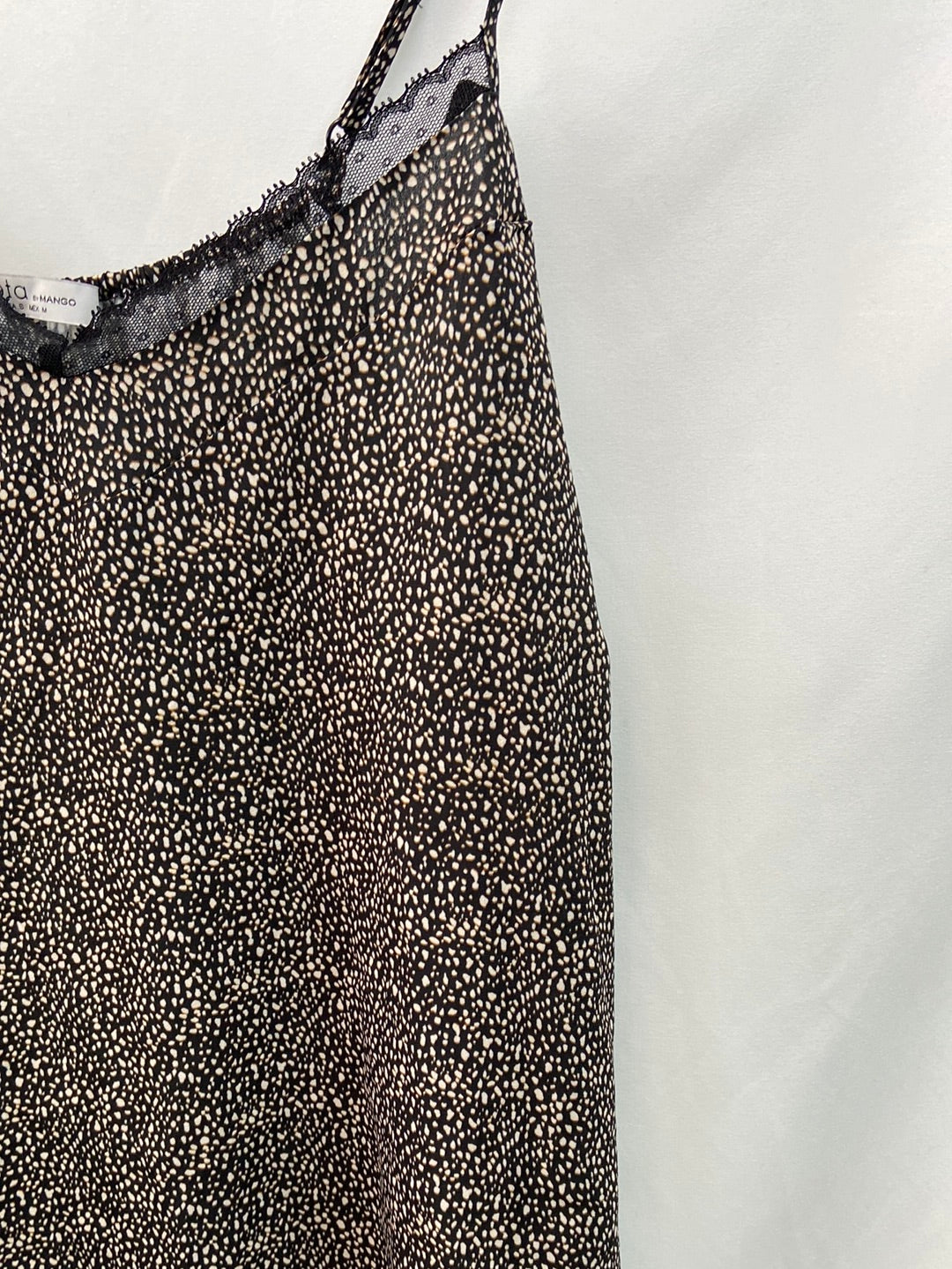 Lencera estampada tonos negros y marrones. Encaje en el escote. Tirantes ajustables.