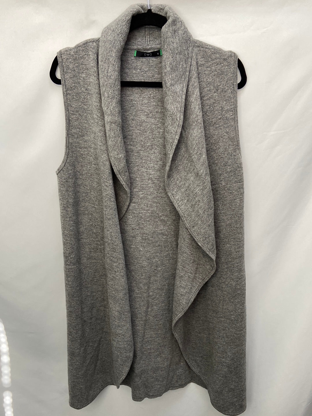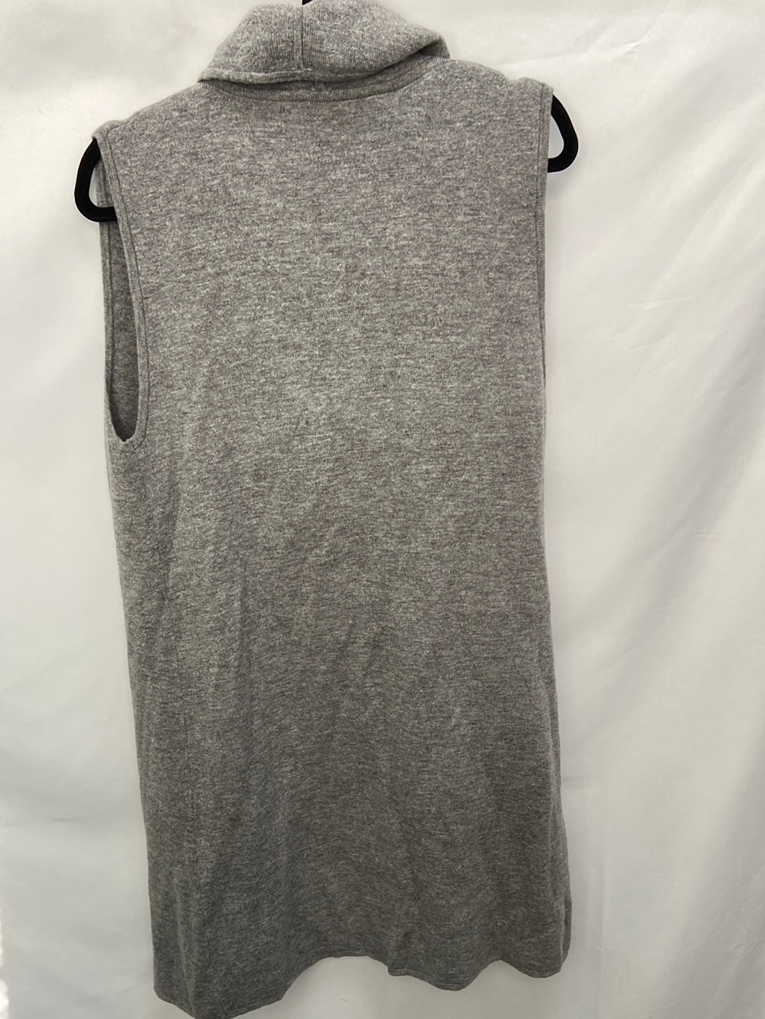 Chaleco de punto gris con la parte delantera fluida. elástico. No se abrocha. Largo 100 cm