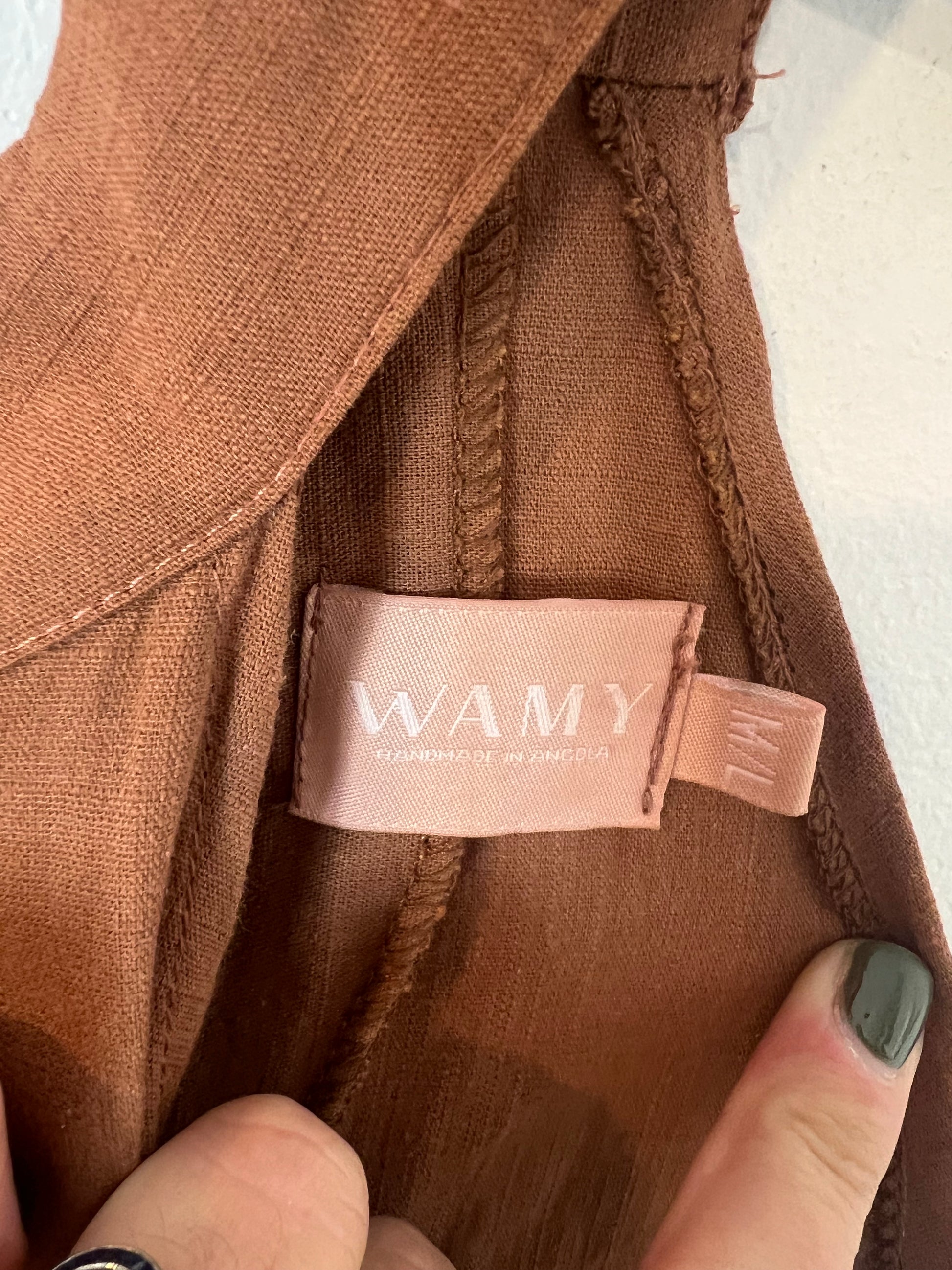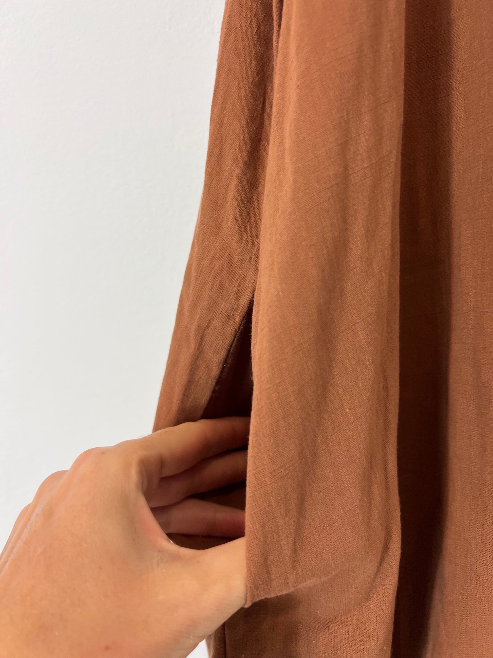 Vestido largo marrón escote halter con detalle de caracolas . De sisa a sisa 49cm, largo 137cm