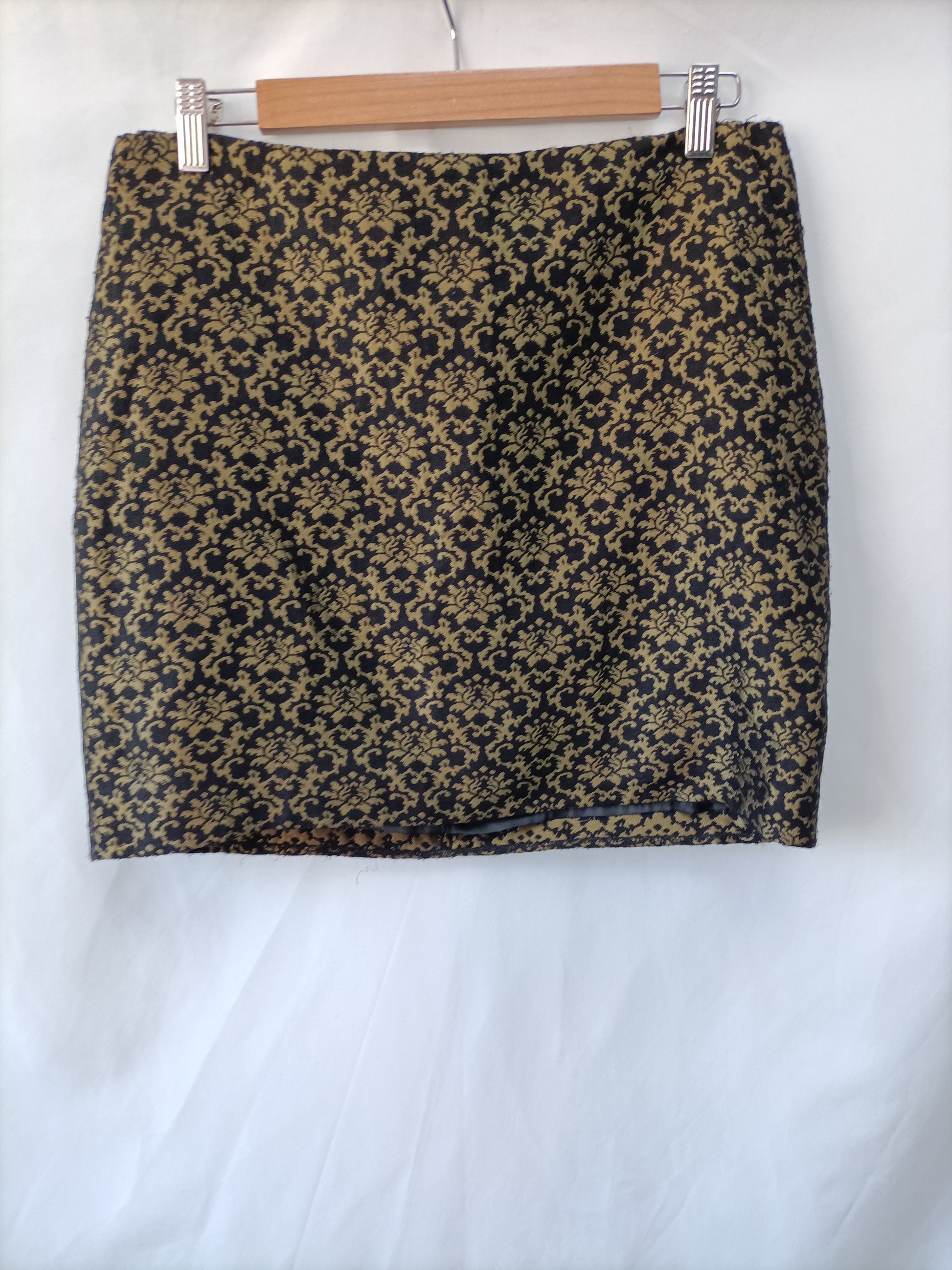 Falda corta negra con estampado tipo retro en verde. No es elástico. Cintura 42 cm largo 44 cm