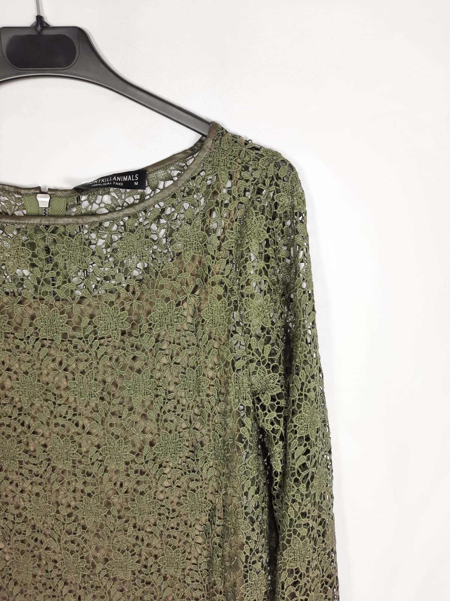 Vestido verde corto de encaje. Es elástico y tiene forro interior de tirantes. Mangas semitransparentes. Largo 95 cm