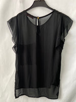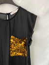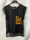 Blusa fluida negra semitransparente con un bolsillo de lentejuelas doradas.