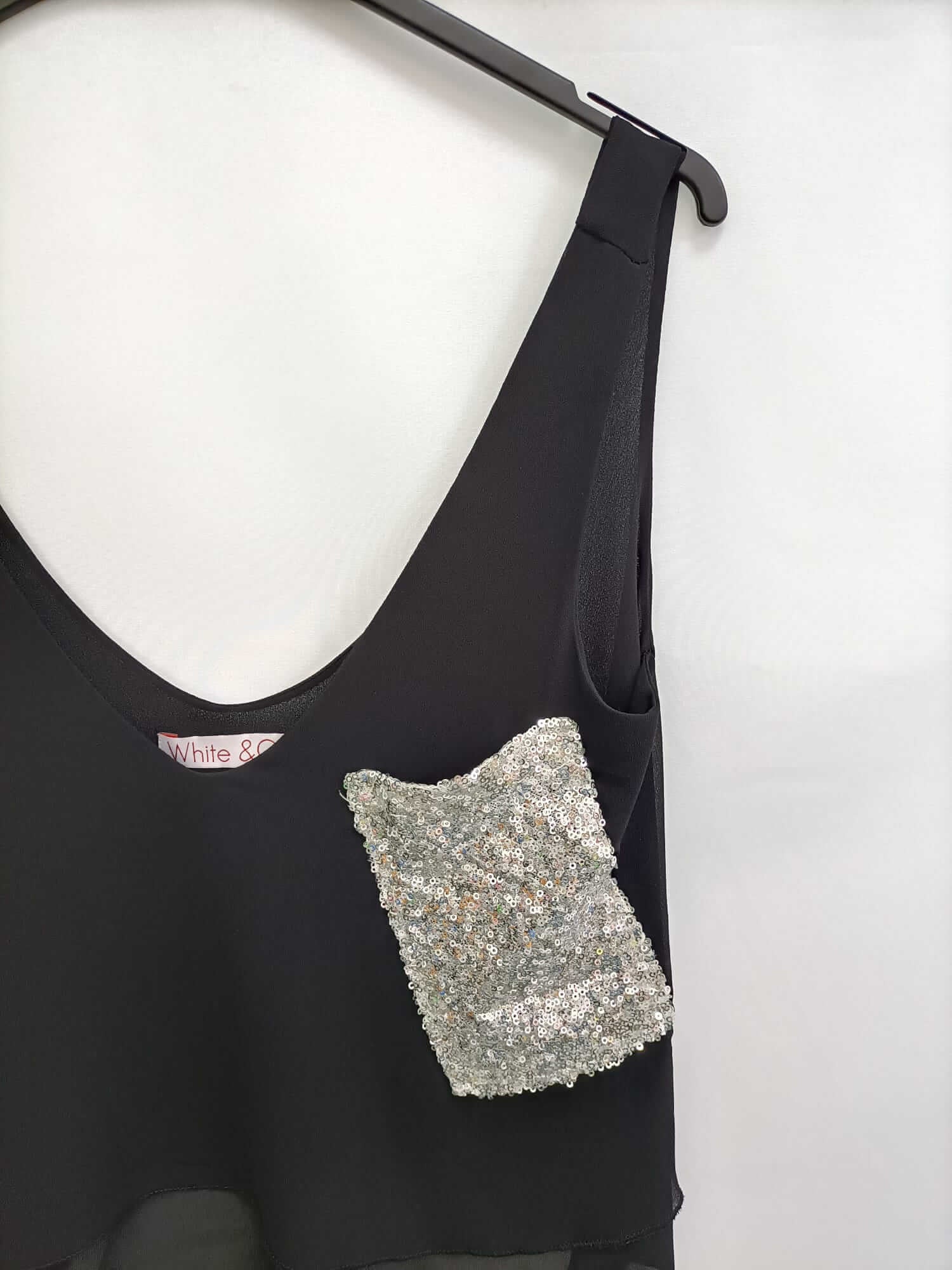 White &one. Tu (s/m). Top negro fluido estilo volante con bolsillo de lentejuelas. No elástico. De sisa a sisa 52 cm largo 58 cm