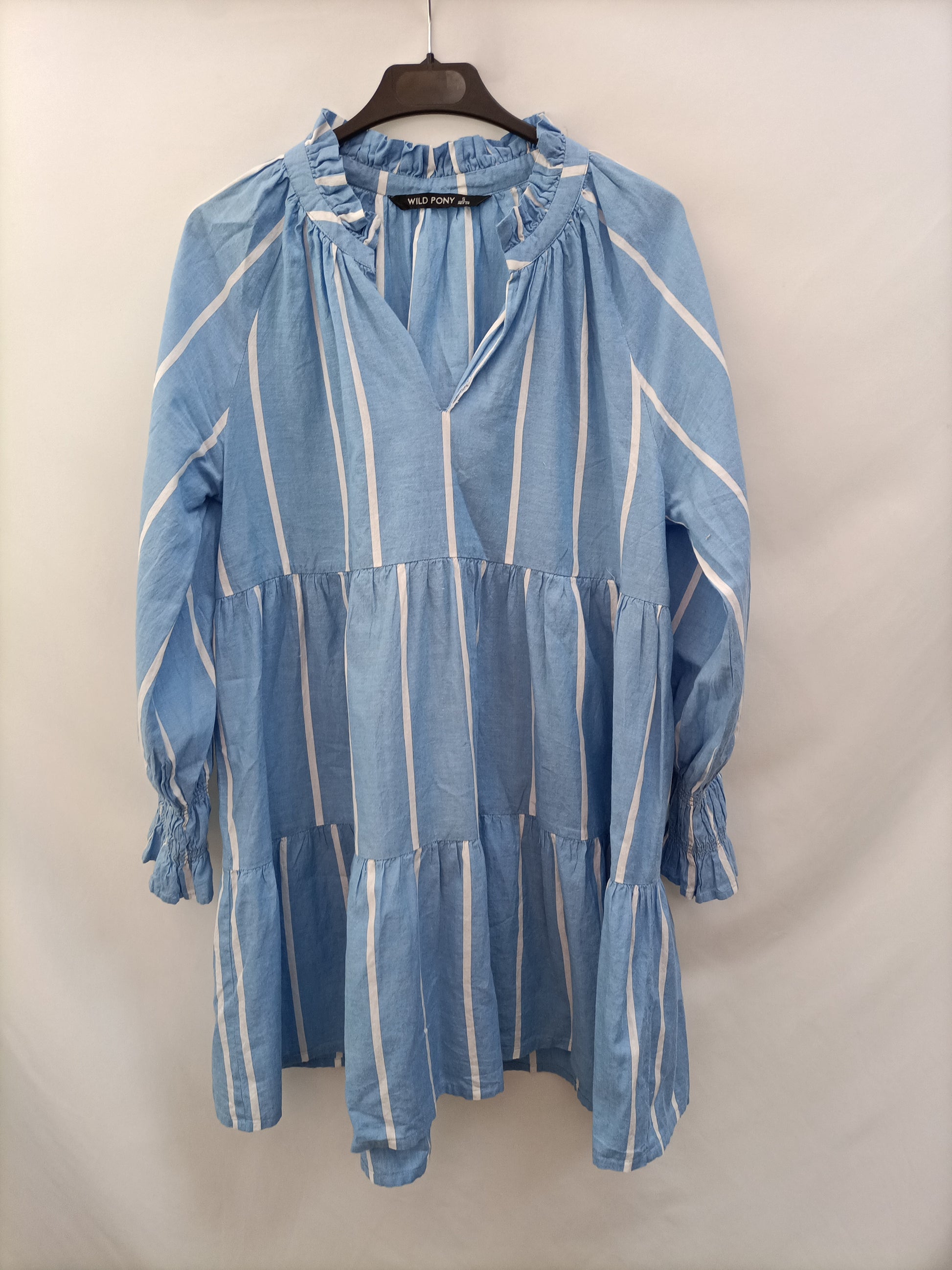 Vestido azul rayas blancas volantes. De sisa a sisa 50 cm, largo 87 cm