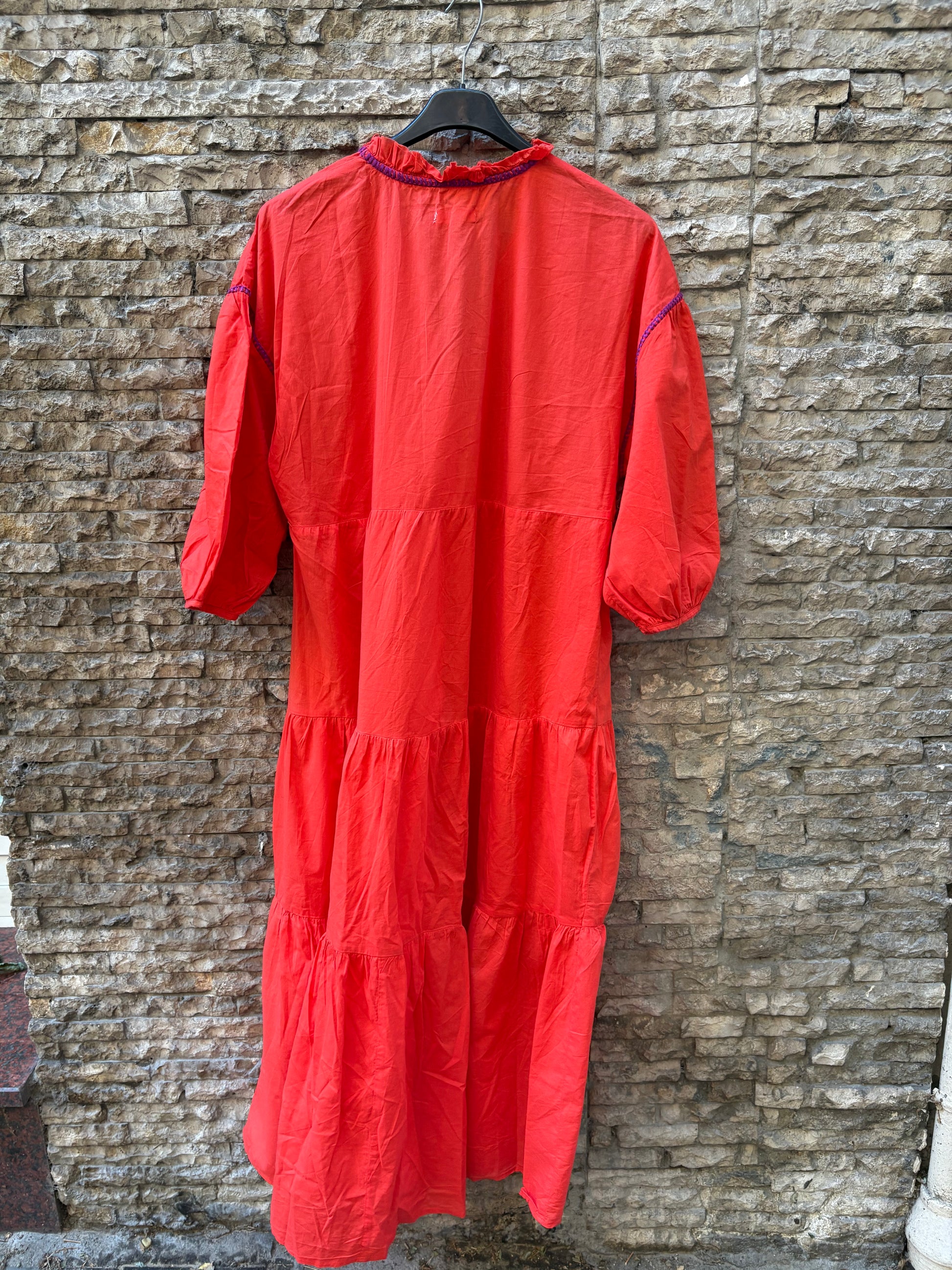 Vestido largo rojo bordados. Espalda 55 cm , largo 122 cm