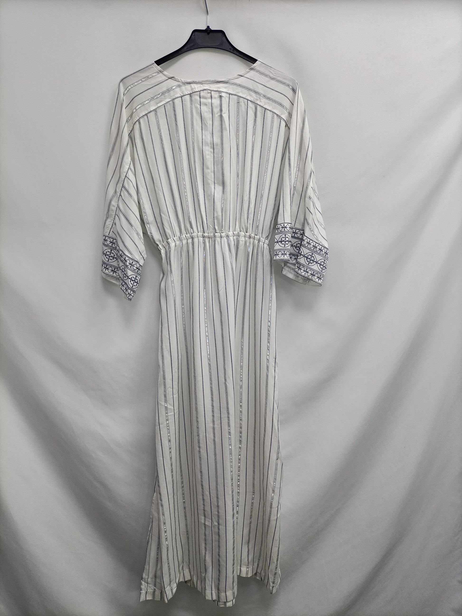 Vestido largo blanco con rayas azules y plateadas. Cintura elástica. Largo 129 cm