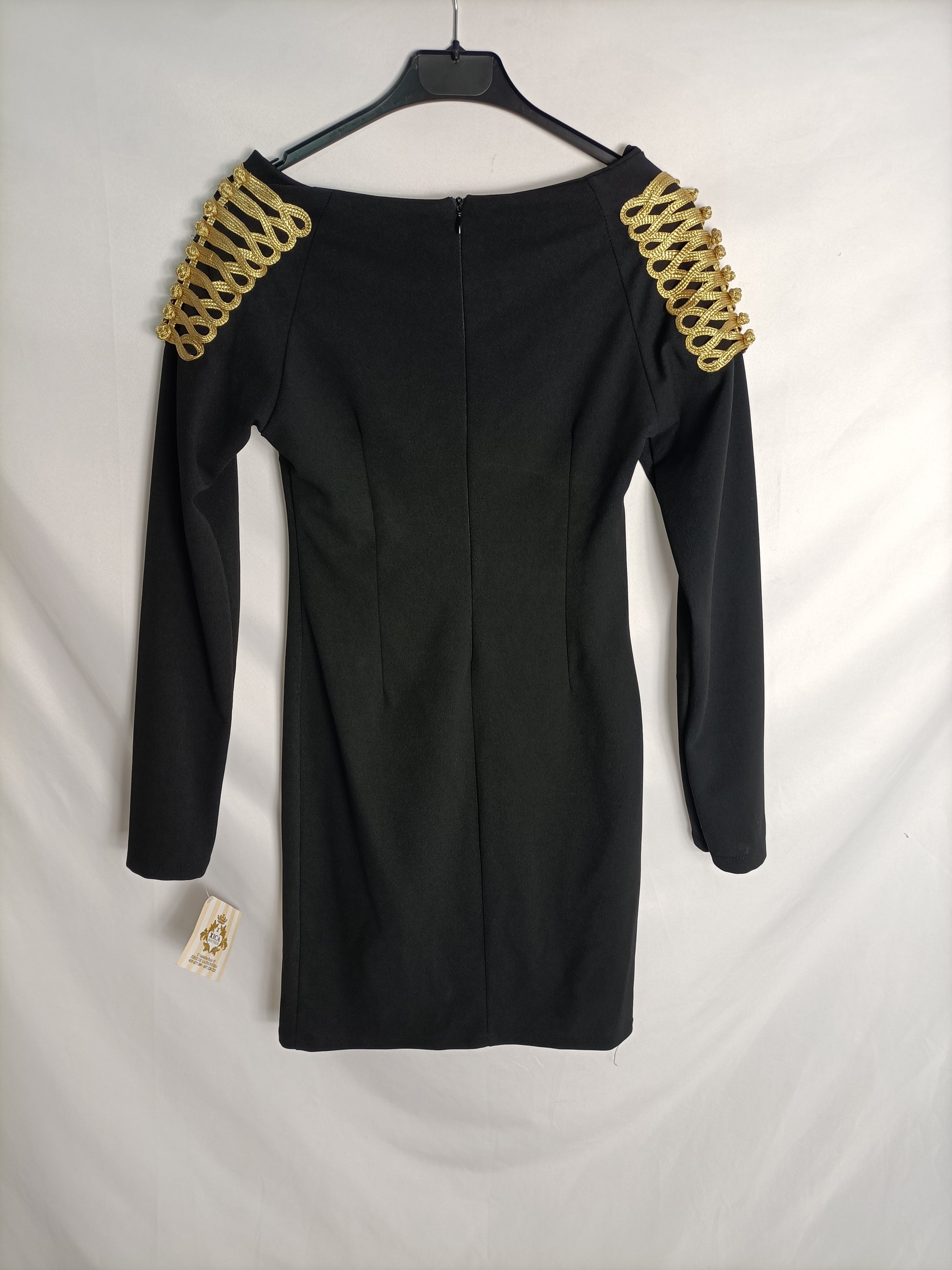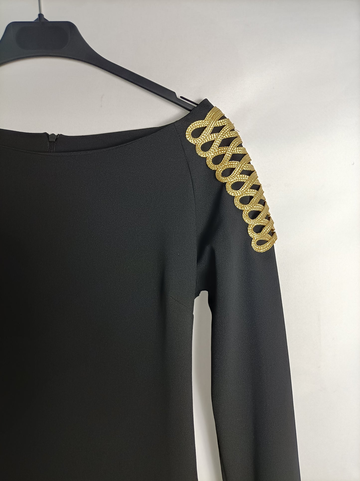 XICA BOUTIQUE.Vestido negro detalle dorado hombreras T.s