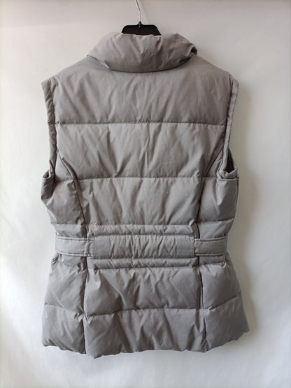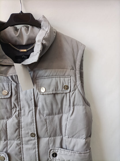 Yera. Plumas gris sin mangas. Ajistado en la cintura. No elástico. De sisa a sisa 51 cm largo 69 cm