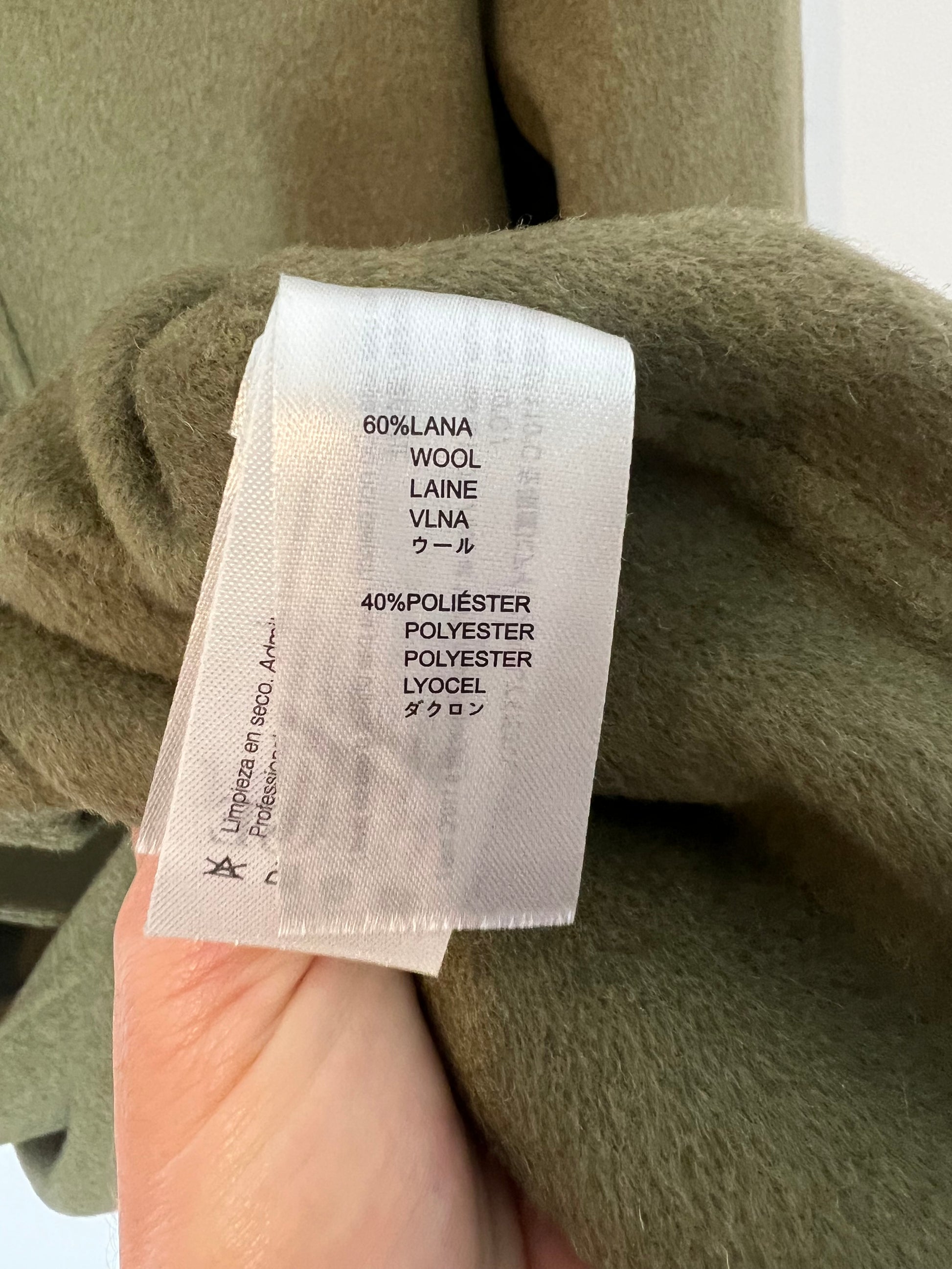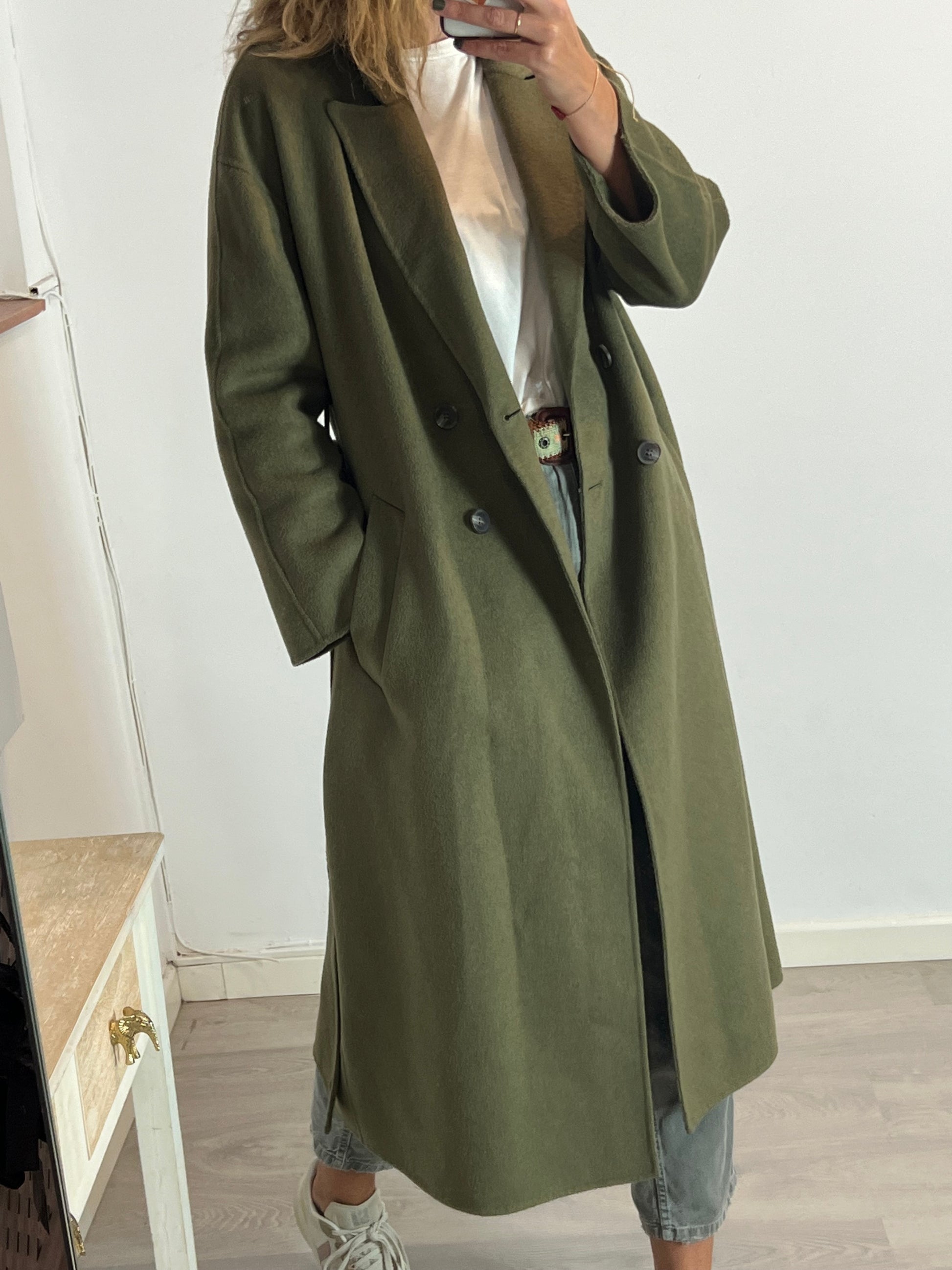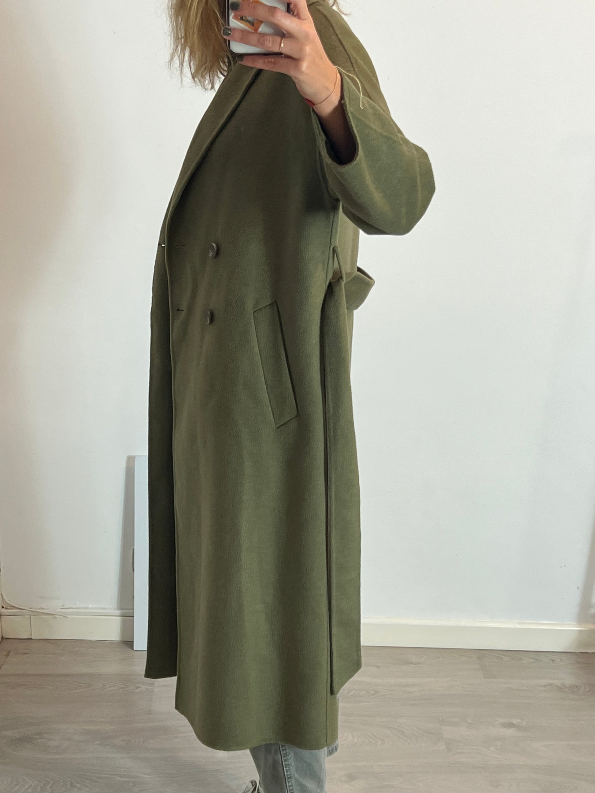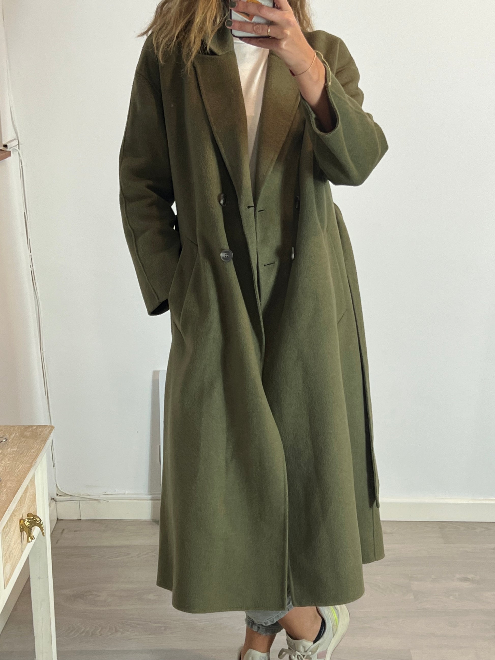 NUEVO CON ETIQUETA. Abrigo largo lana verde con cinturón. De sisa a sisa 51cm, largo 121cm