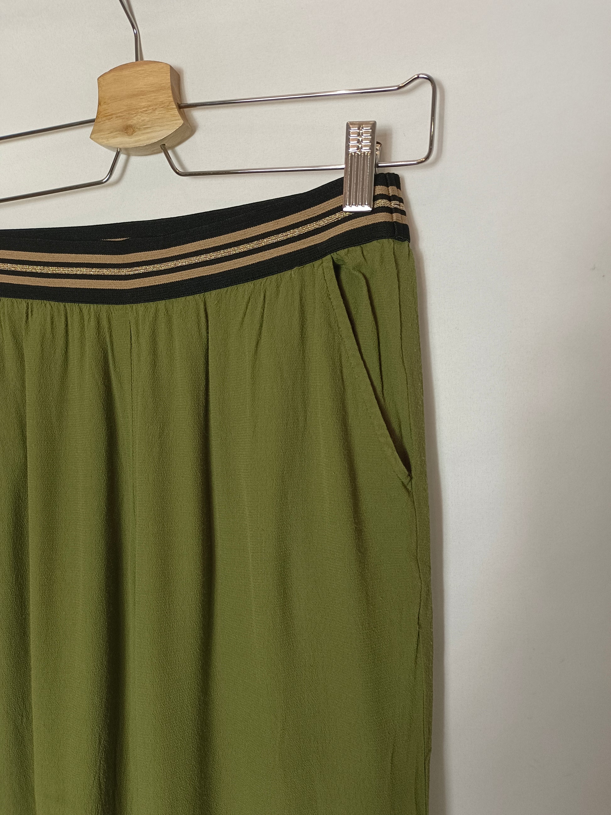 Pantalón recto fluido verde con cintura elástica de rayas con detalles dorados