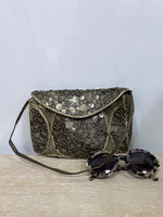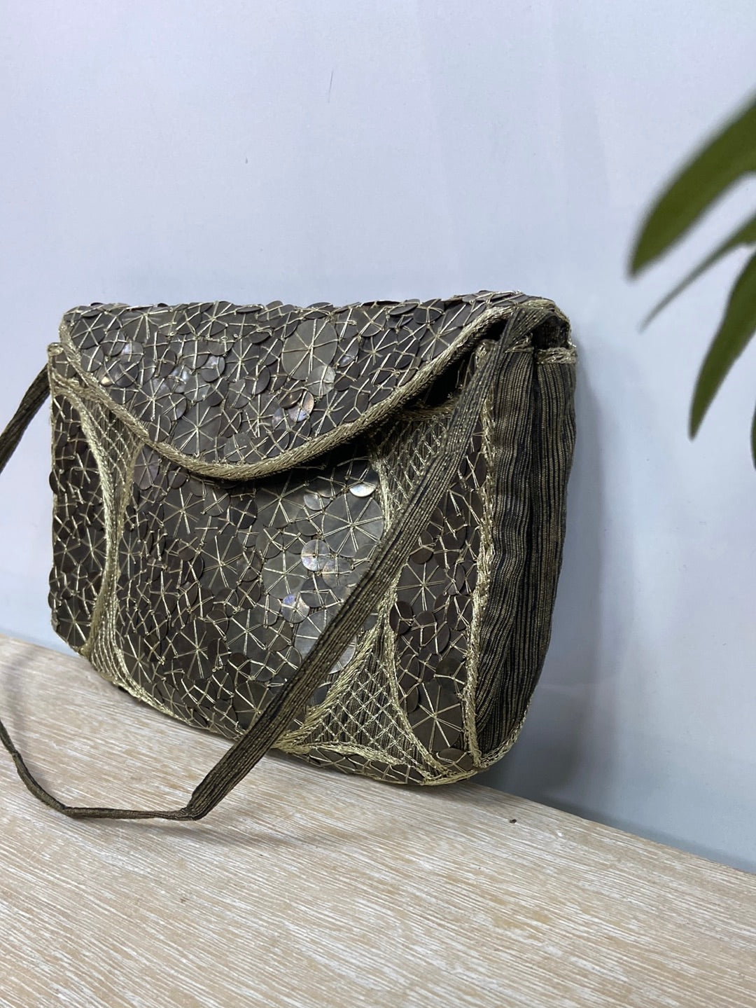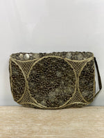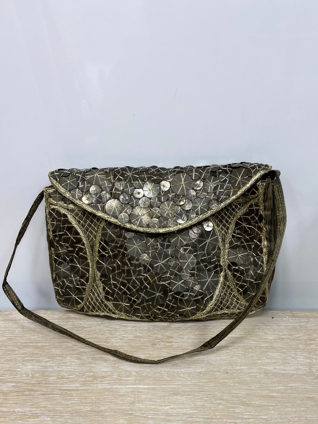 Bolso vintage de lentejuelas ocre. Asa corta. Largo 21 cm alto 16 cm ancho 4 cm