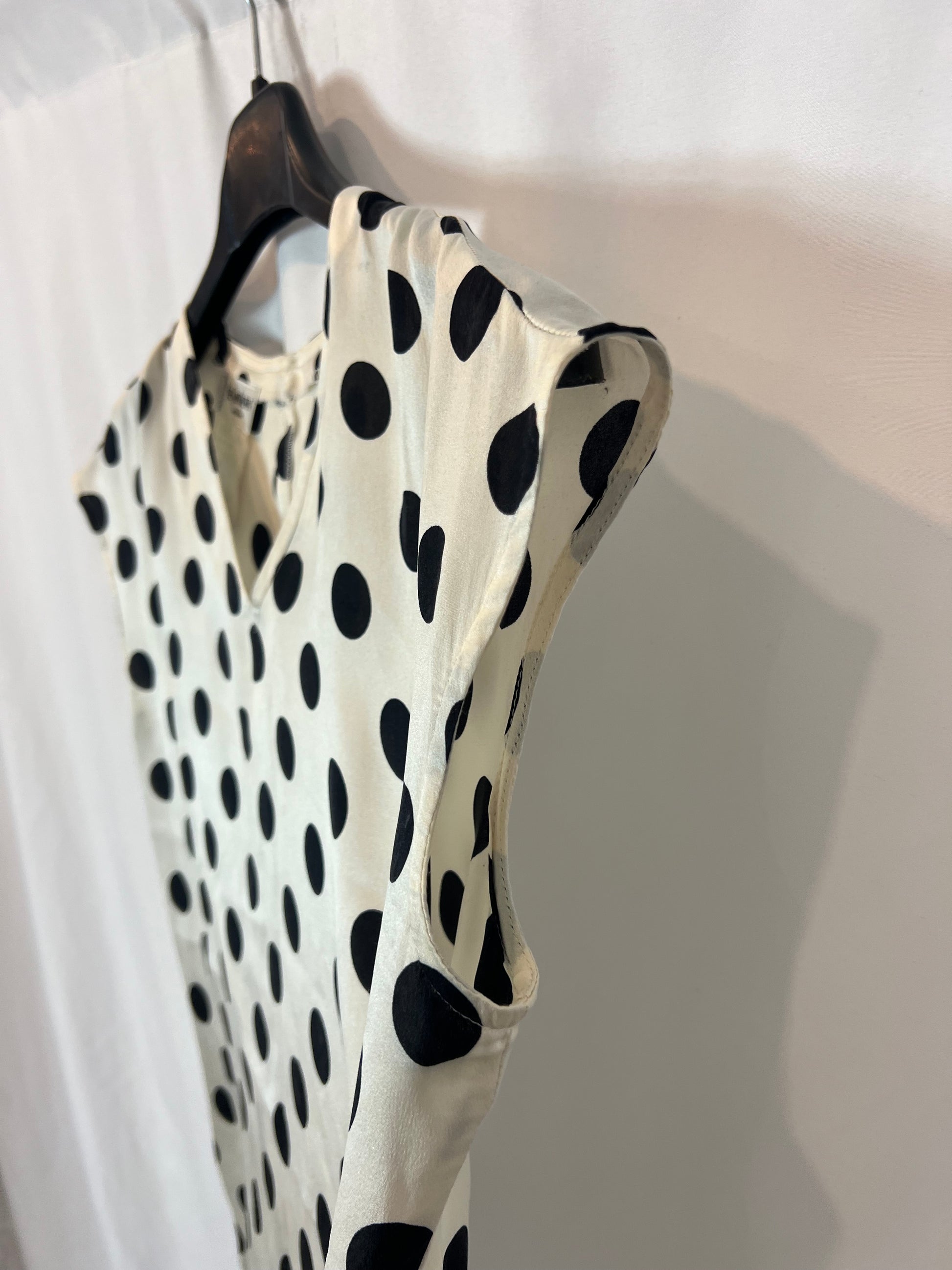 Top fluido lunares. Parece seda pero la etiqueta es ilegible. De sisa a sisa 45cm, largo 58cm
