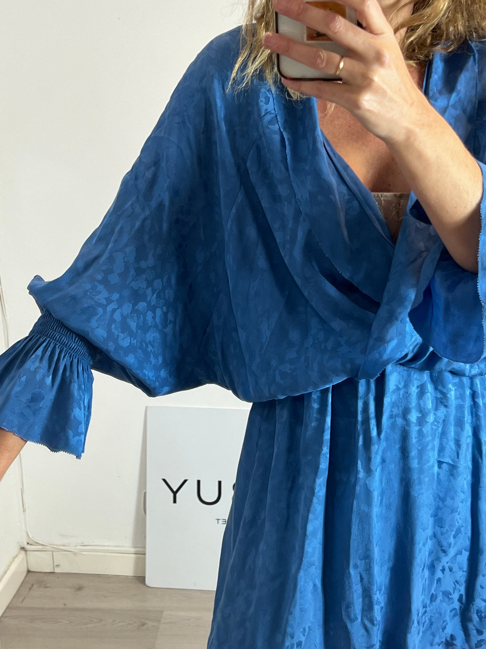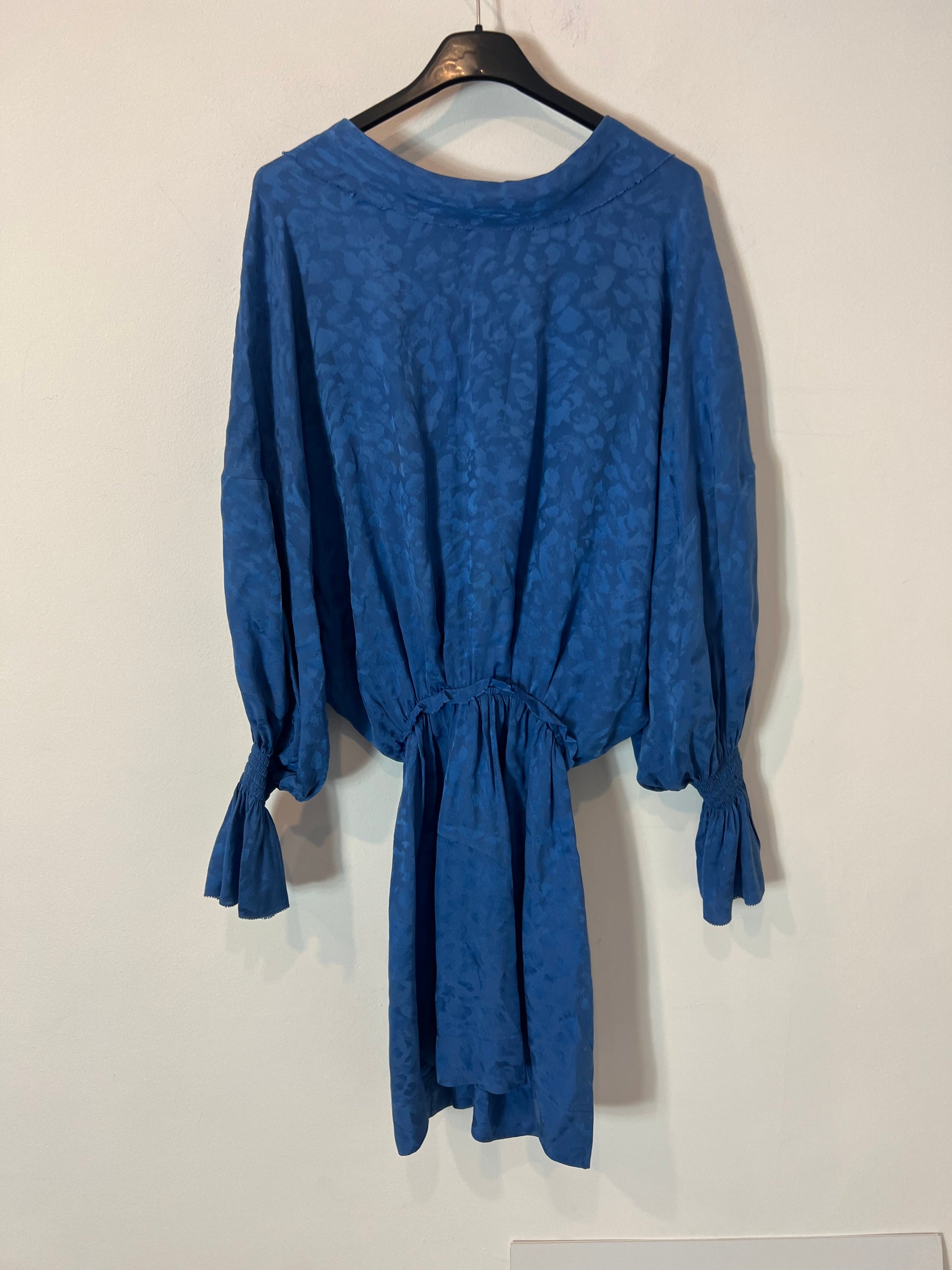 Vestido azul estampado de seda. Escote cruzado y elástico en la cintura. cintura 36 cm largo 88 cm