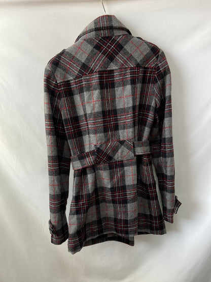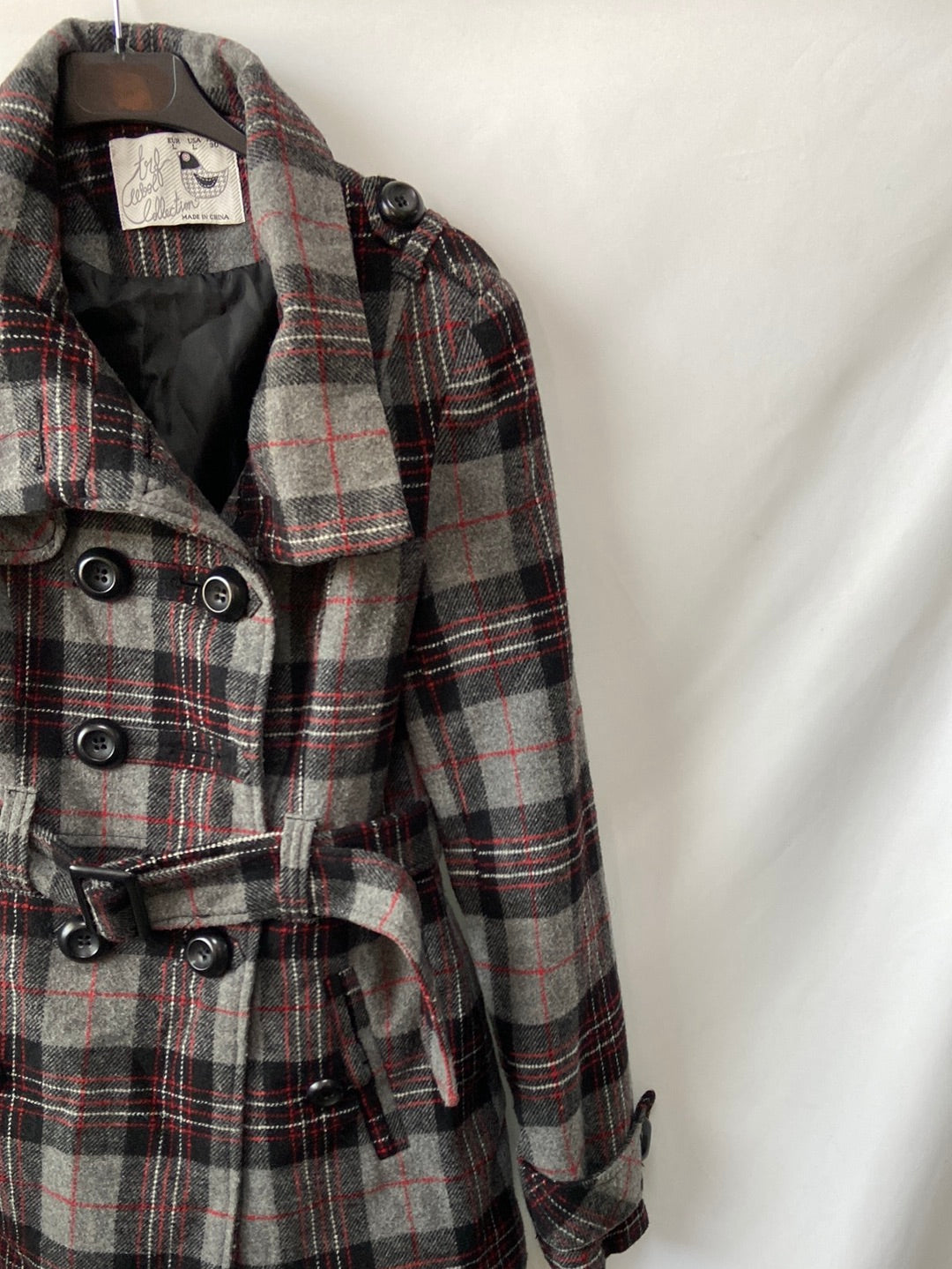 Abrigo de paño con estampado de cuadros es cruzado y con cinturón. No elástico. De sisa a sisa 43 cm, Largo 78 cm