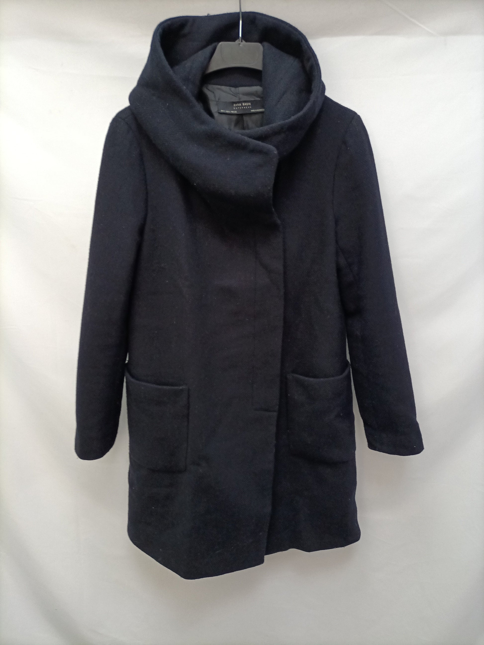 Abrigo de paño azul marino cruzado y con capucha. No elástico. De sisa a sisa 44 cm largo 86 cm