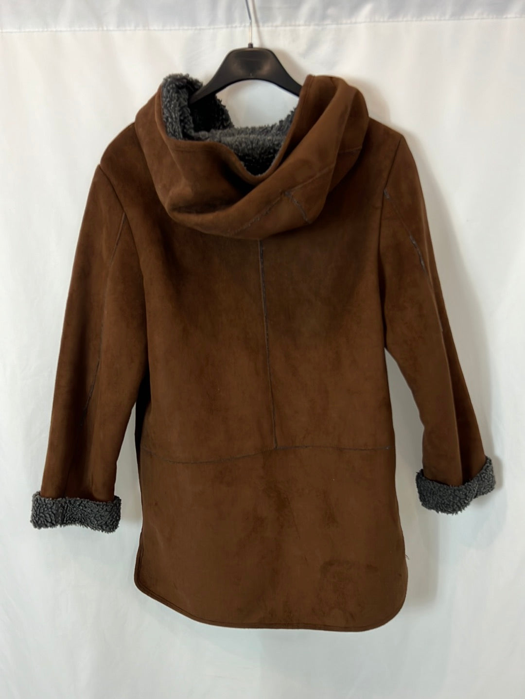 Abrigo marrón de antelina con borrego interior . Largo 69cm