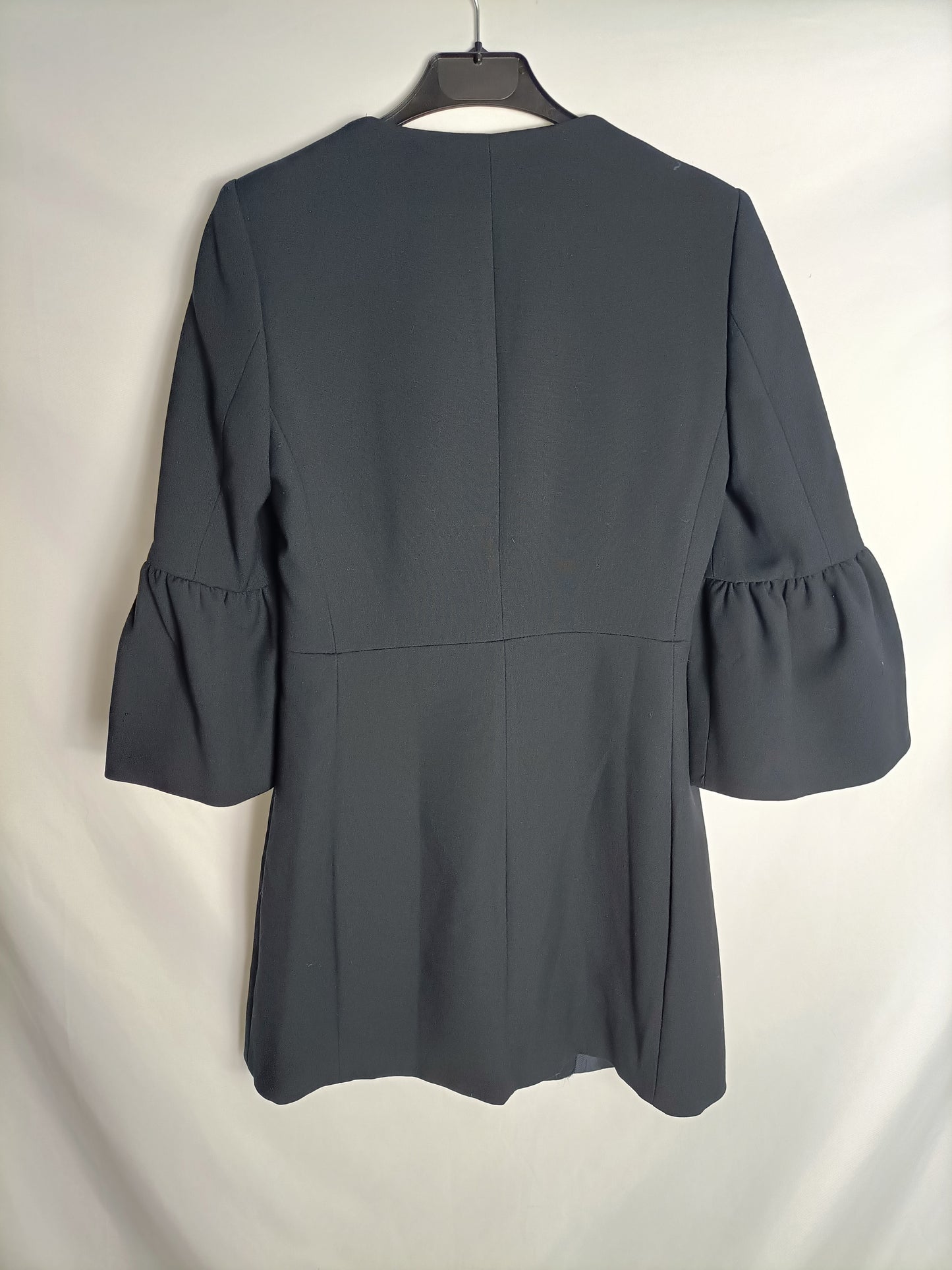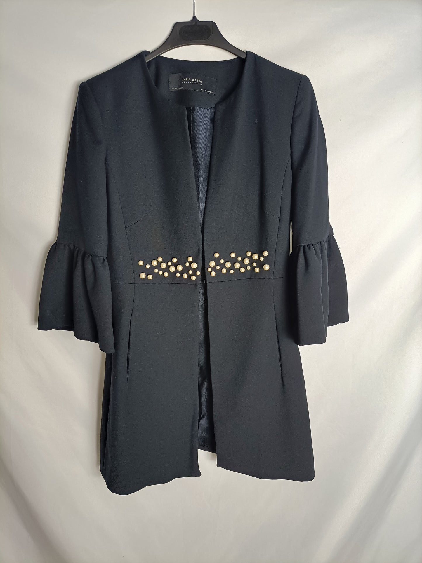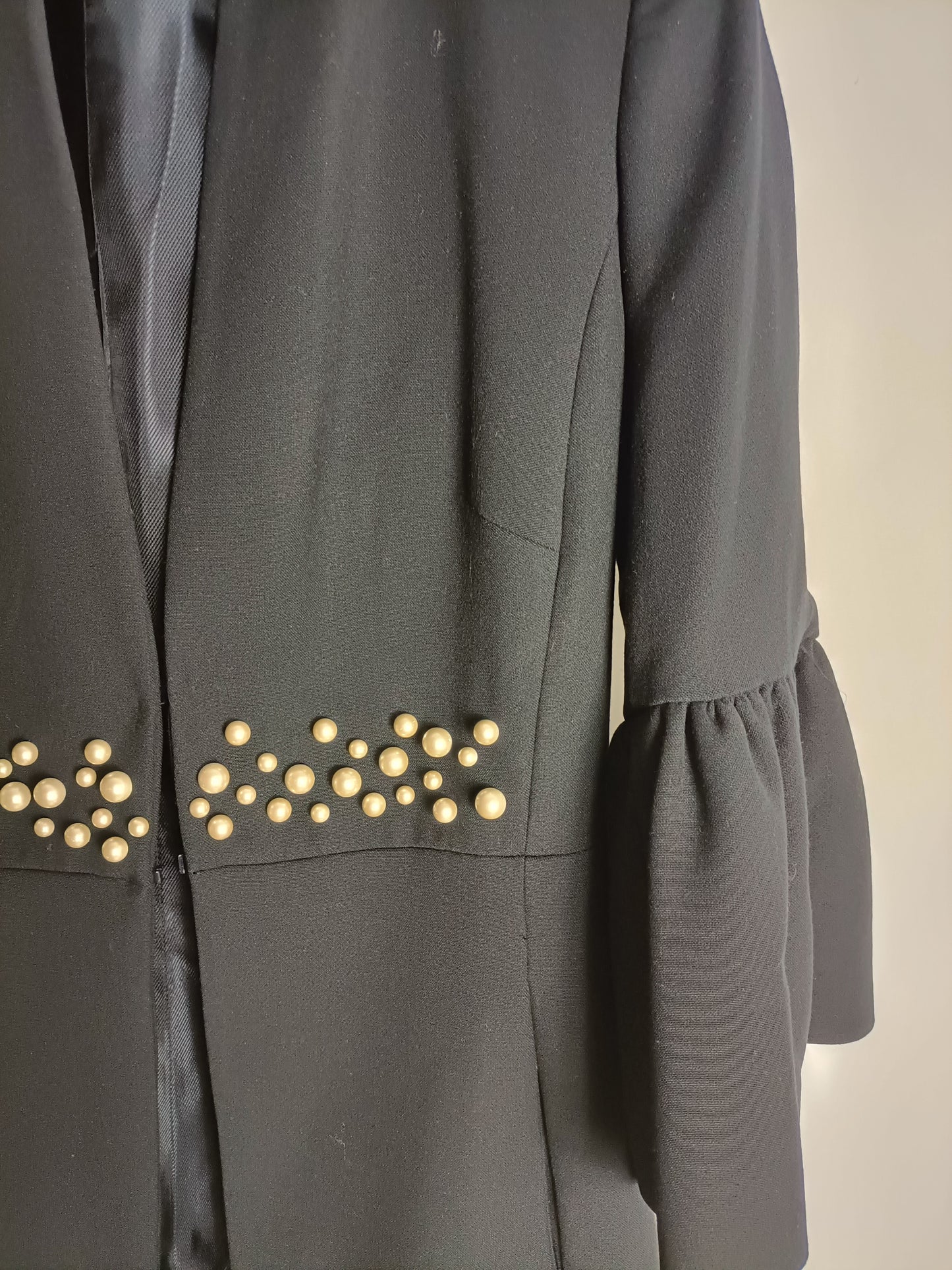 Abrigo negro de vestir con detalle de perlas en la cintura
