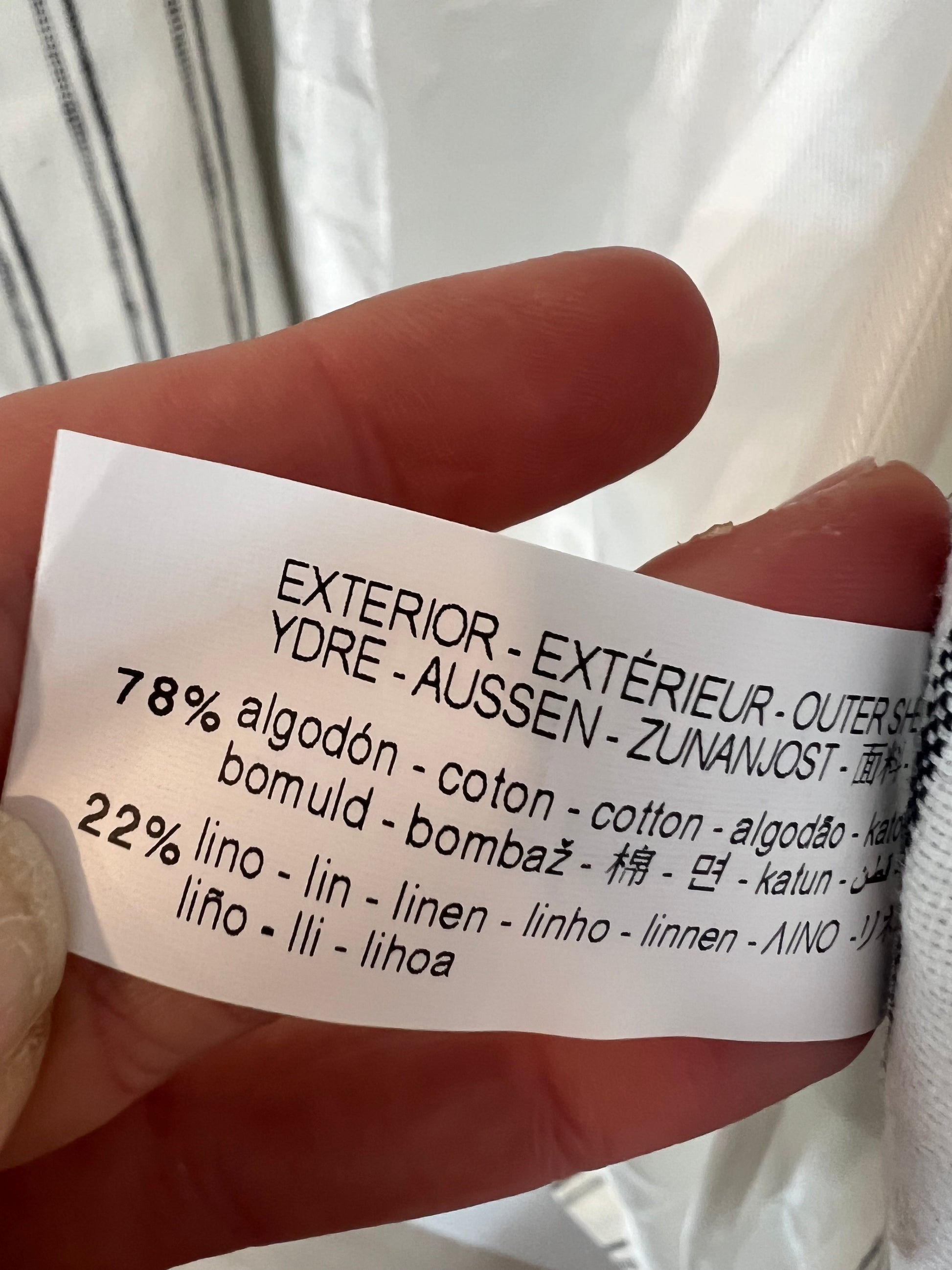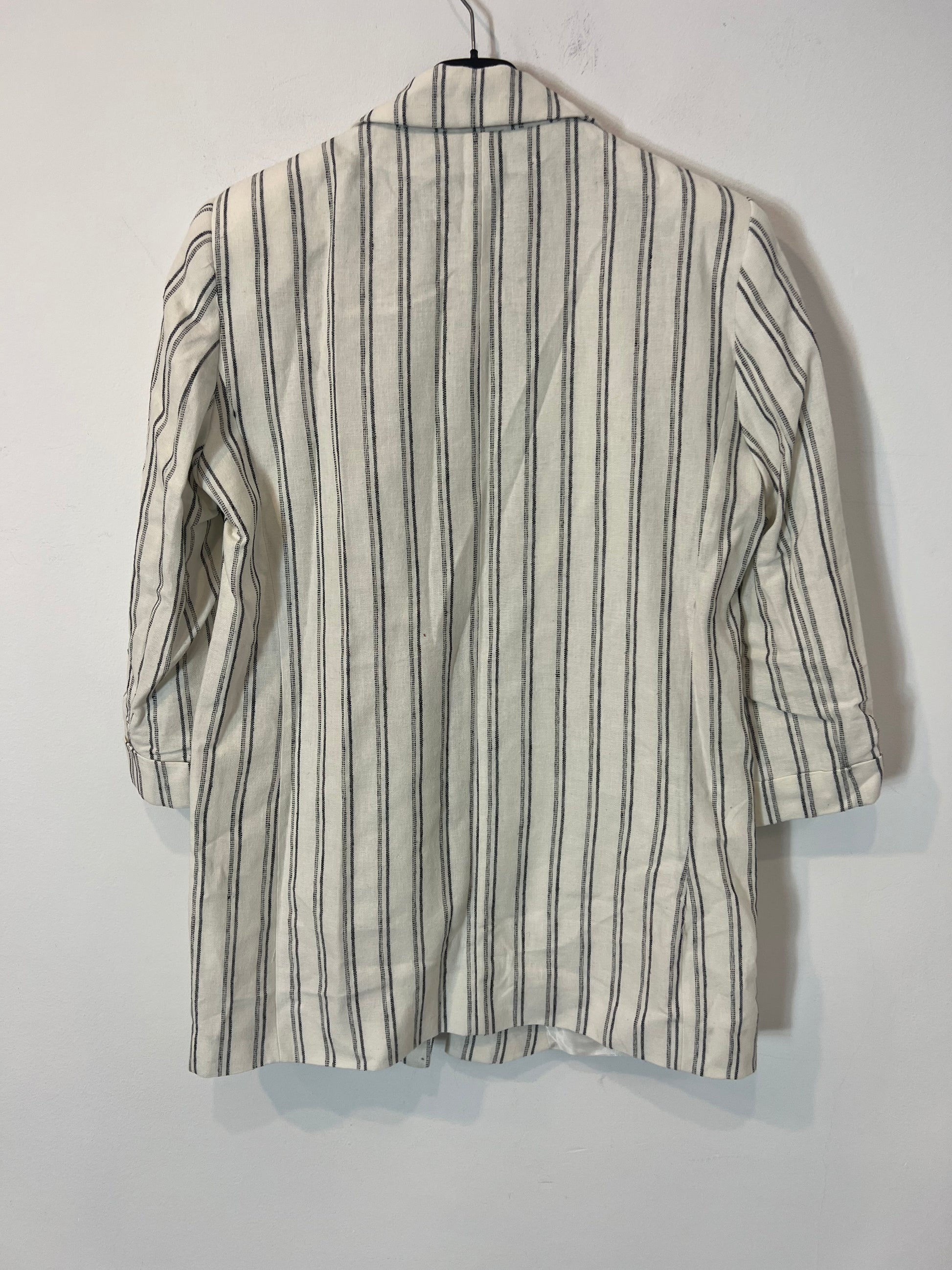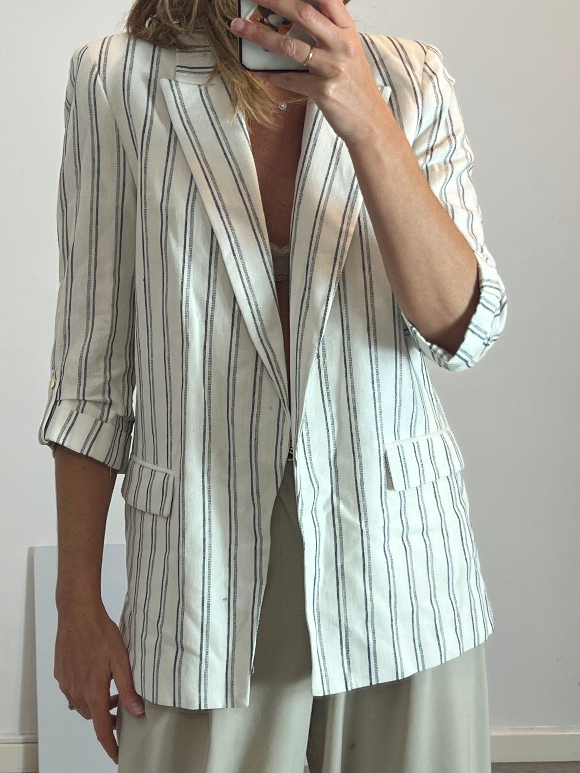 blazer blanca con detalle de rayas bordadas negras. Fluida y no elástica. largo 74 cm.