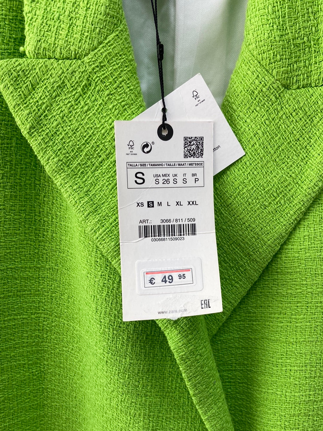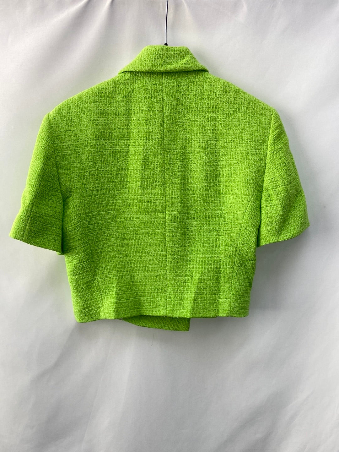 NUEVA CON ETIQUETA. chaqueta cortita verde de tejido tweed. Le falta un botón. Largo 46 cm .