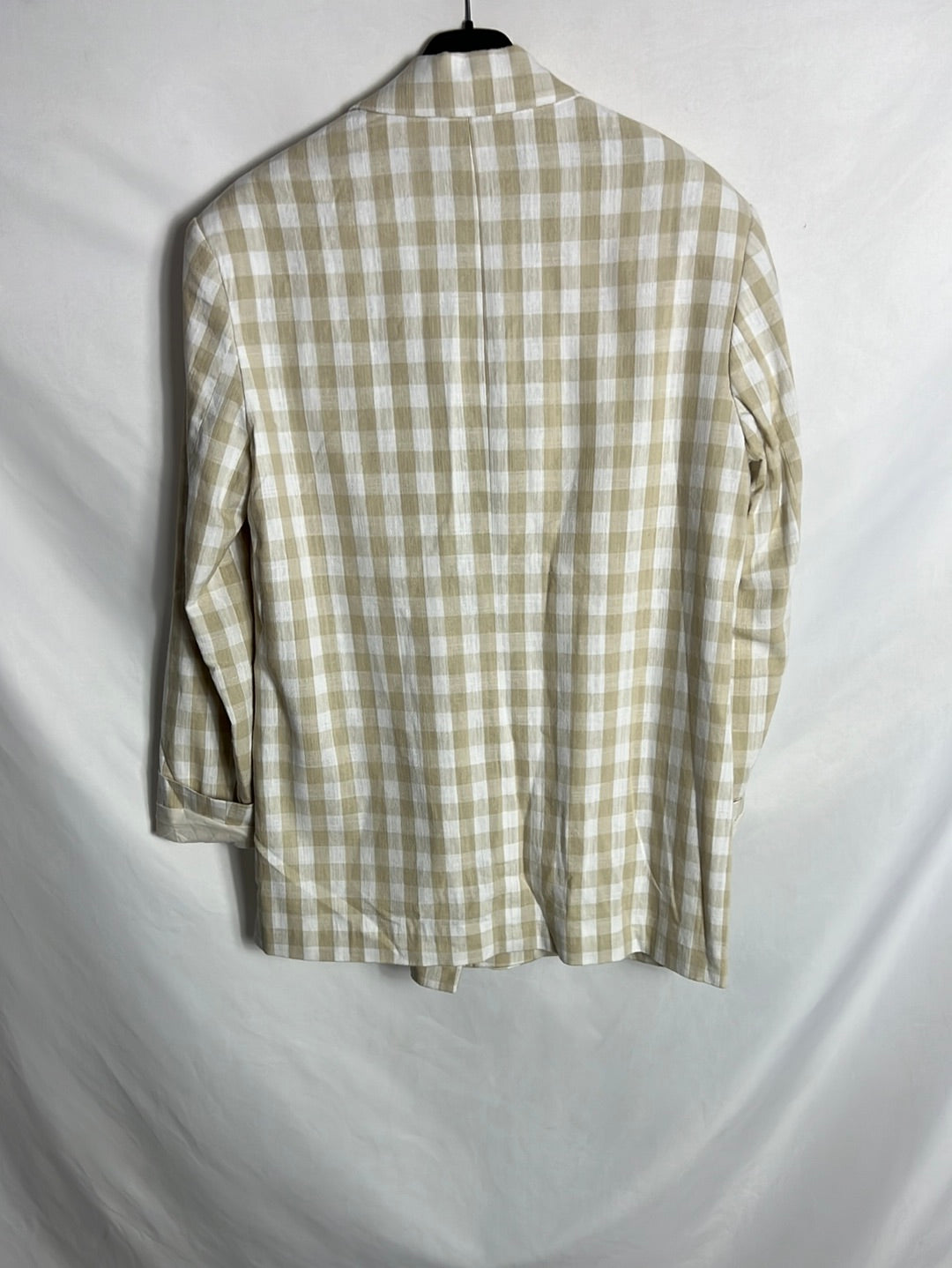 blazer de cuadros beige y blanco. algodón y viscosa , hombros 42cm, largo 71cm. Tara: mini mancha flúor en el bolsillo