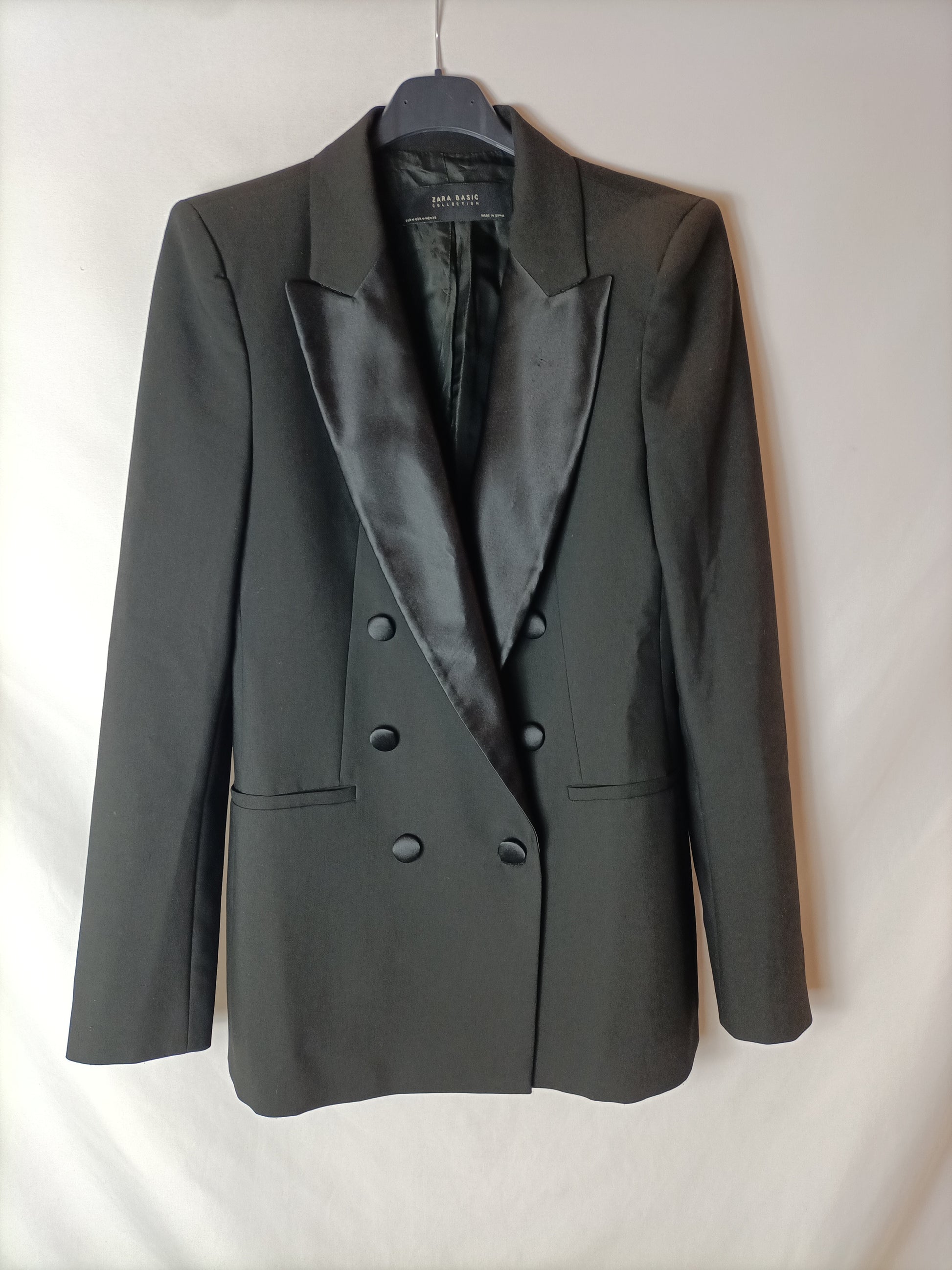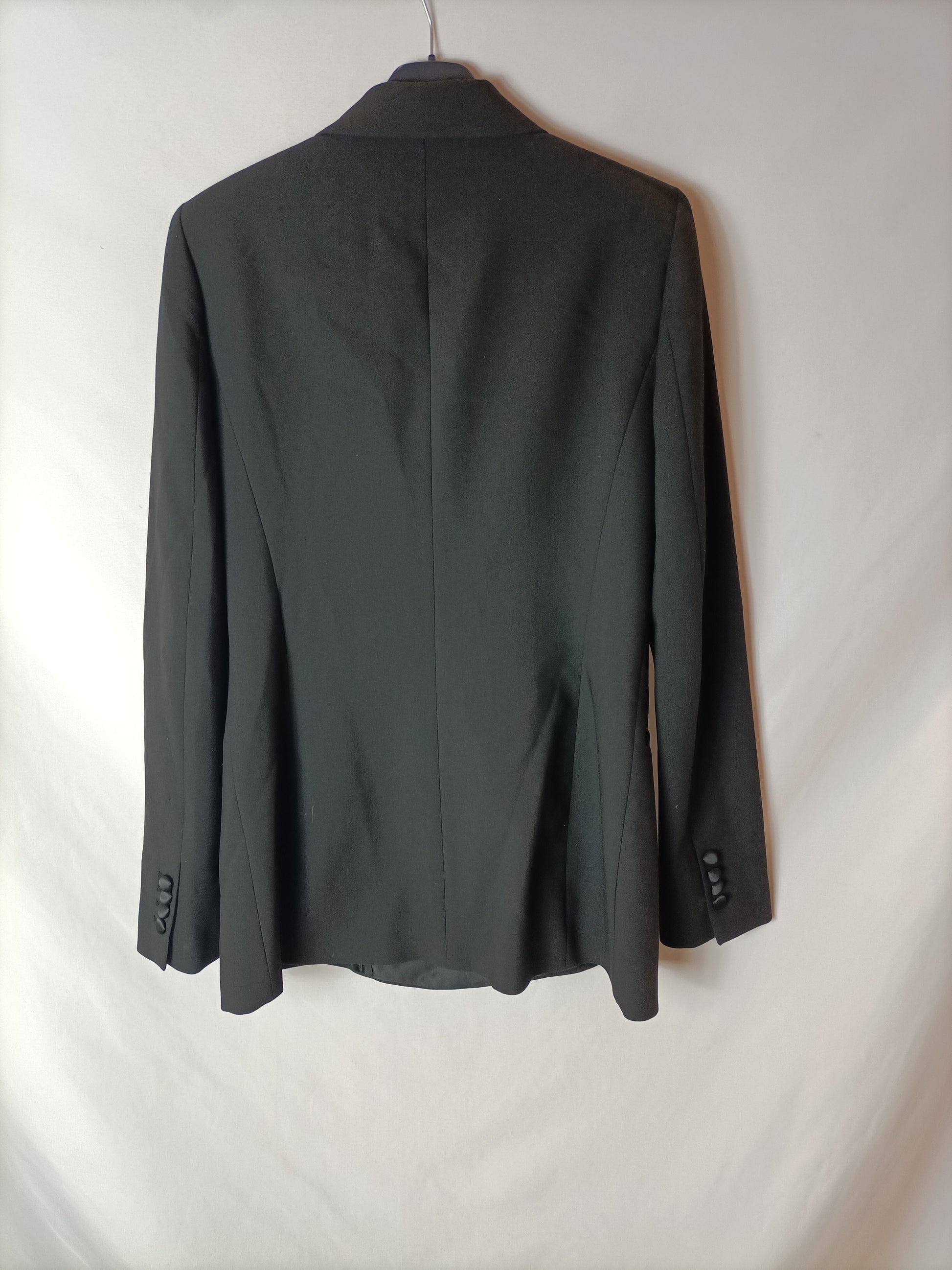 Blazer negra con solapa se raso. Se cierra con botones cruzada. sisa a sisa 45 cm.
