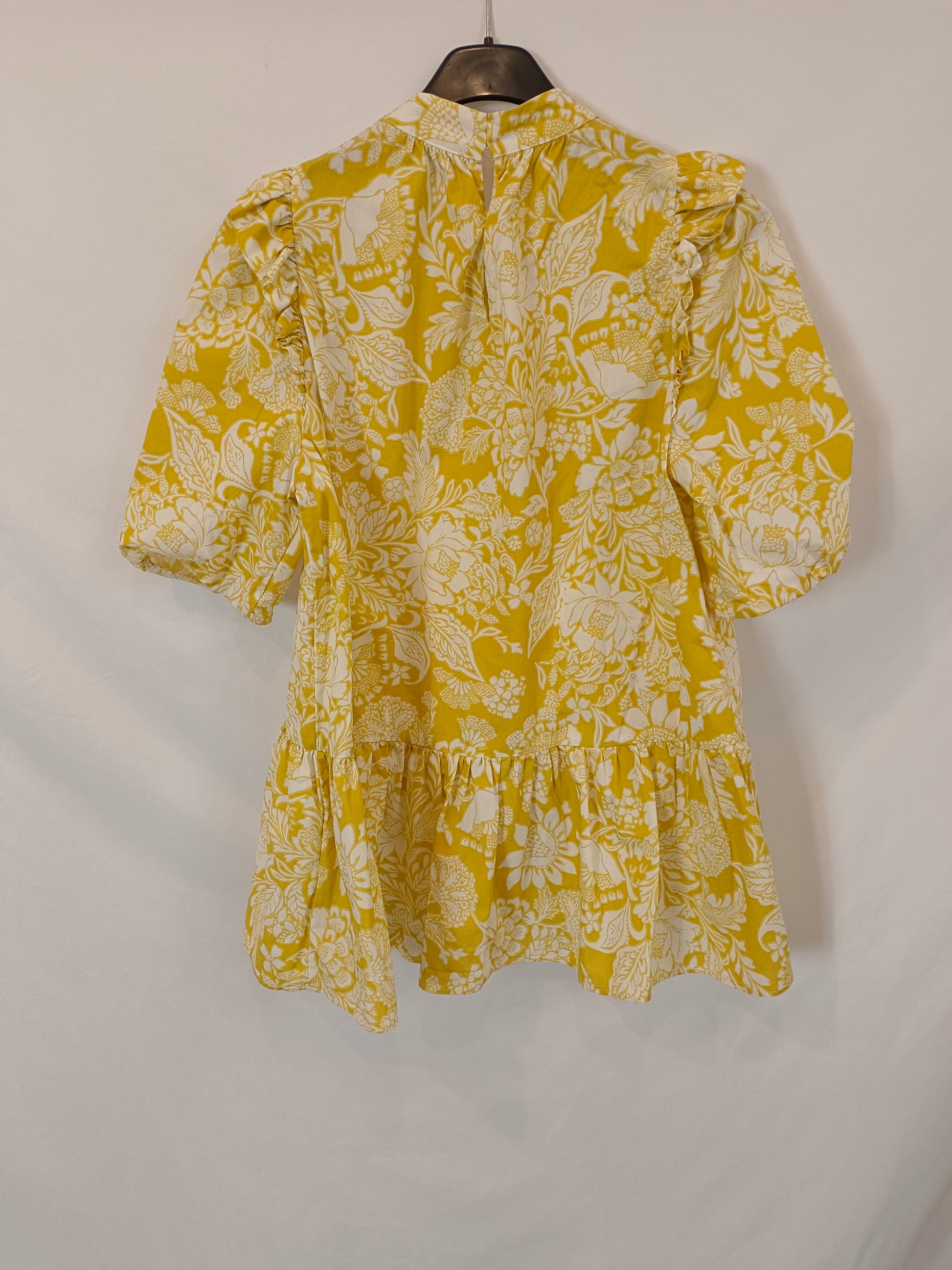blusa amarilla con estampado de flores y mangas abullonadas. Espalda 49 cm largo 67 cm