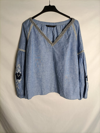 Blusa jaspeada azul y blanco con las mangas bordadas