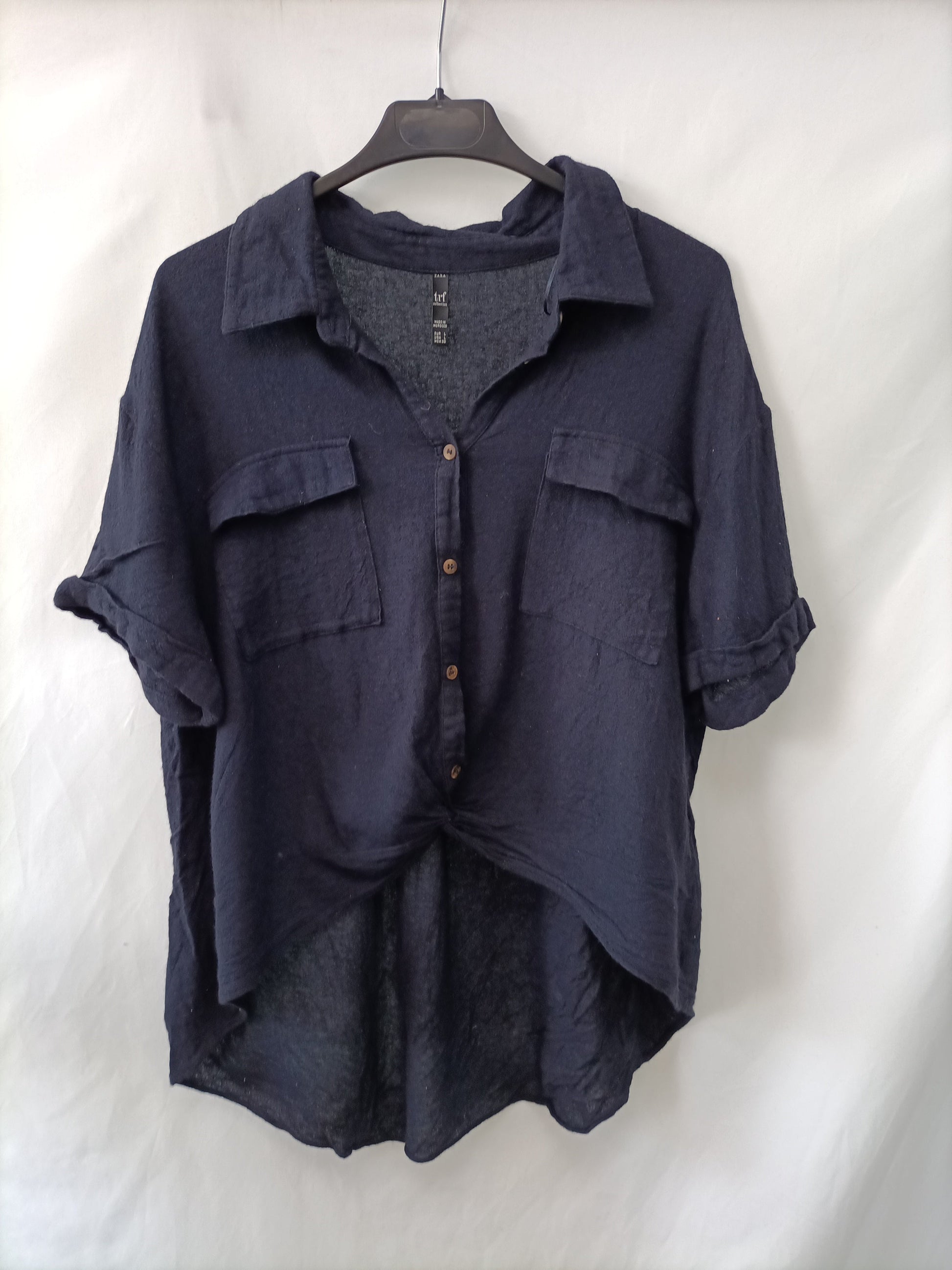 Blusa azul con nudo delantero y bajos asimétricos. De sisa a sisa 56 cm largo 71 cm